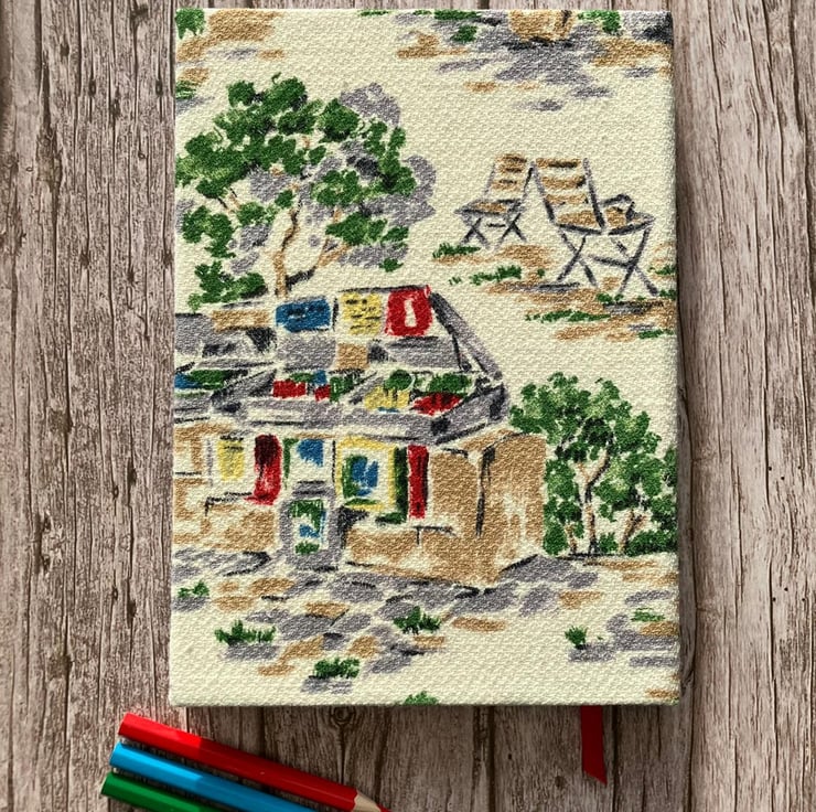 This book is made with care from high quality 100gsm smooth white paper which is carefully hand cut, folded, stitched, and glued. It is then casebound using high quality book board covered with genuine vintage cotton barkcloth fabric from the 1940's.
