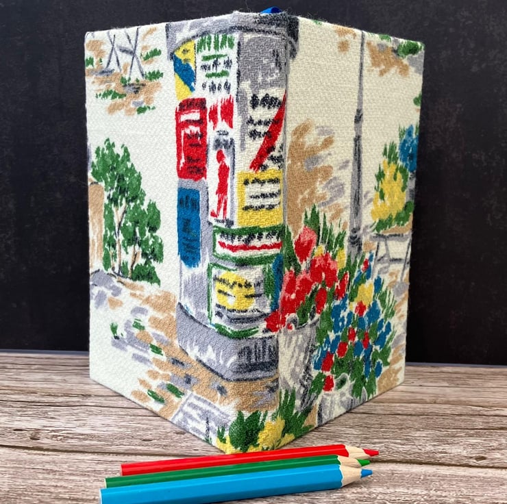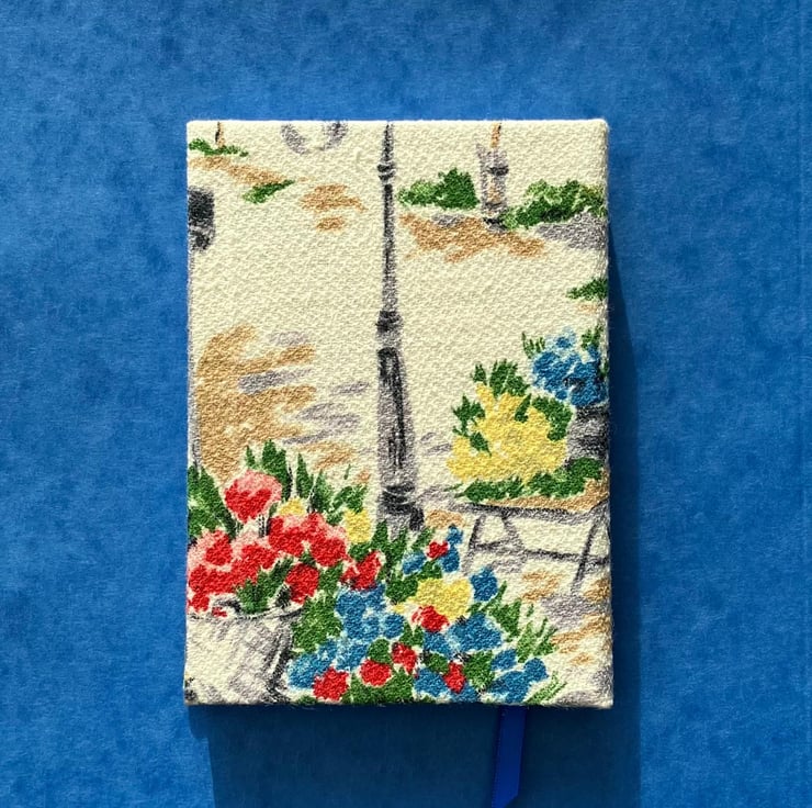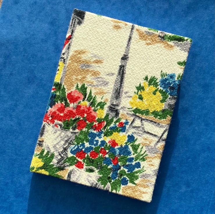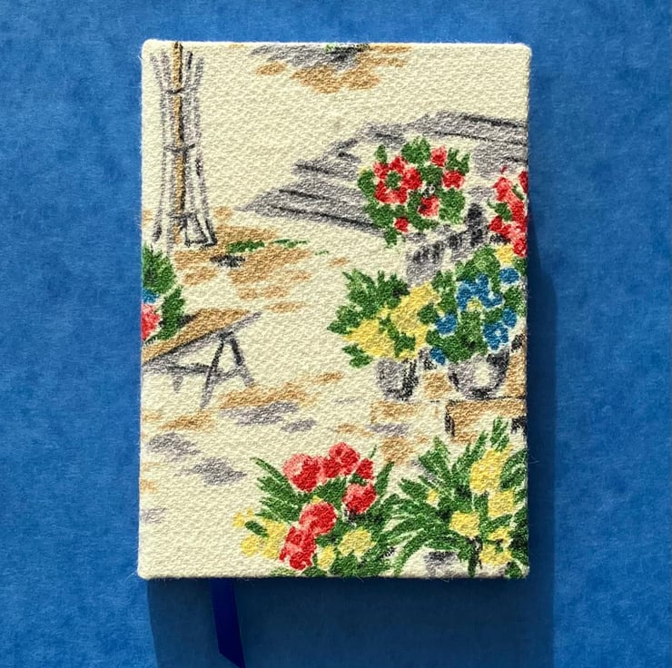 Handbound A6 1950's Vintage Barkcloth Sketchbook, Journal, Paris, Spring, Blue