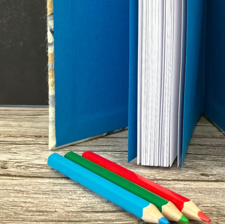 Every book I make includes a ribbon page marker, and coloured end-papers made from high quality Canford paper, hand picked to match one of the colours in the fabric design. This book has a blue satin ribbon and matching end papers.