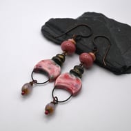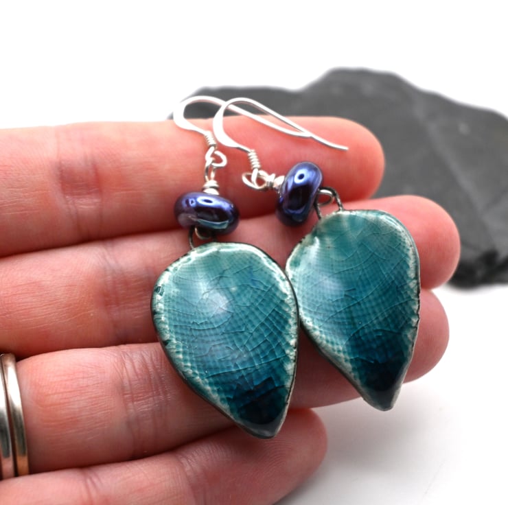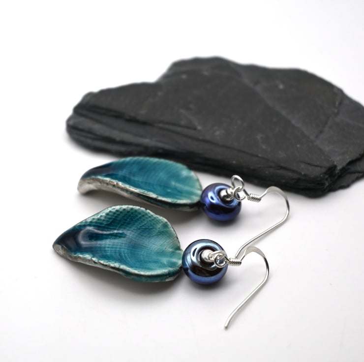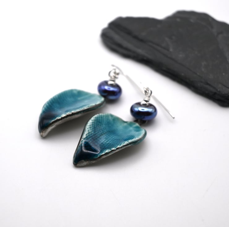 A pair of sterling silver earrings made with handmade lampwork glass beads and handmade blue ceramic leaf charms.