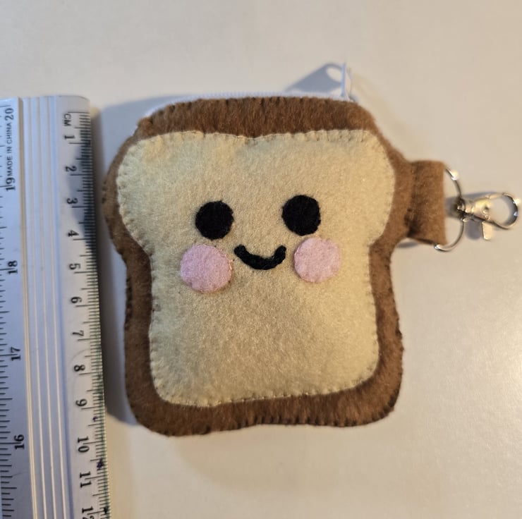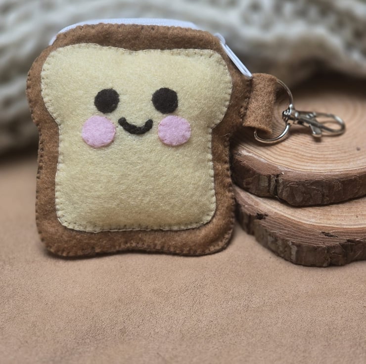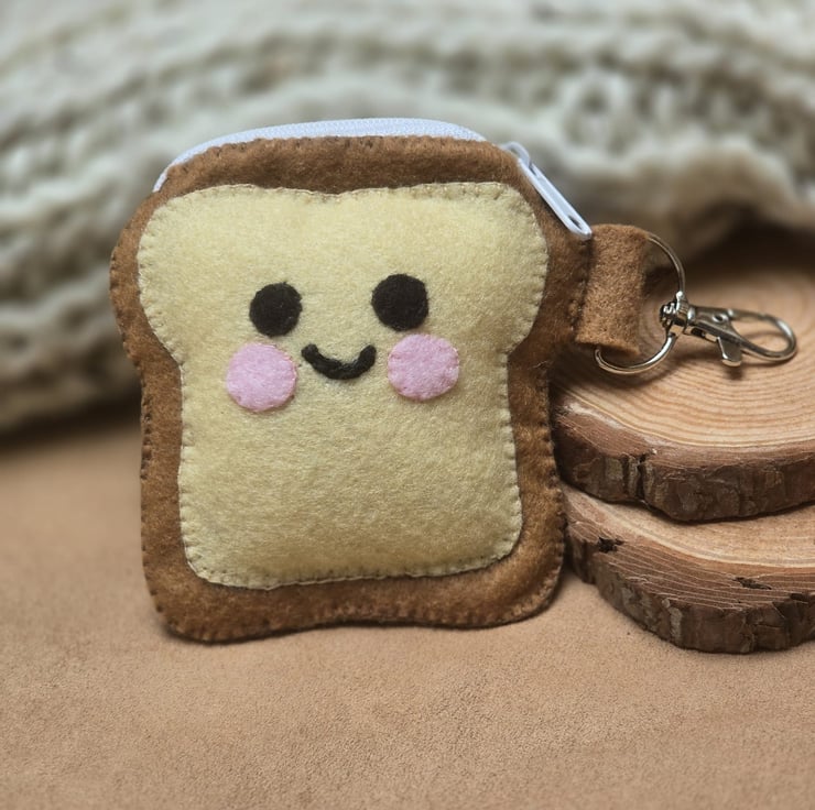 Bring a little smile to your everyday essentials with this handmade felt toast keyring purse. Carefully stitched by hand, this sweet toast character features rosy cheeks and a happy face, making it a fun and functional accessory.