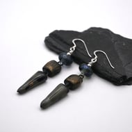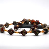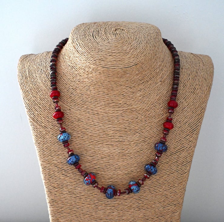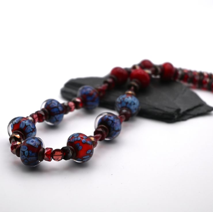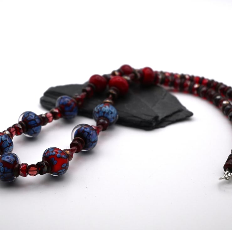 A beaded necklace made with handmade lampwork glass red and blue speckled beads, red Czech glass beads and Grade AA Rhodolite Garnet gemstone beads.