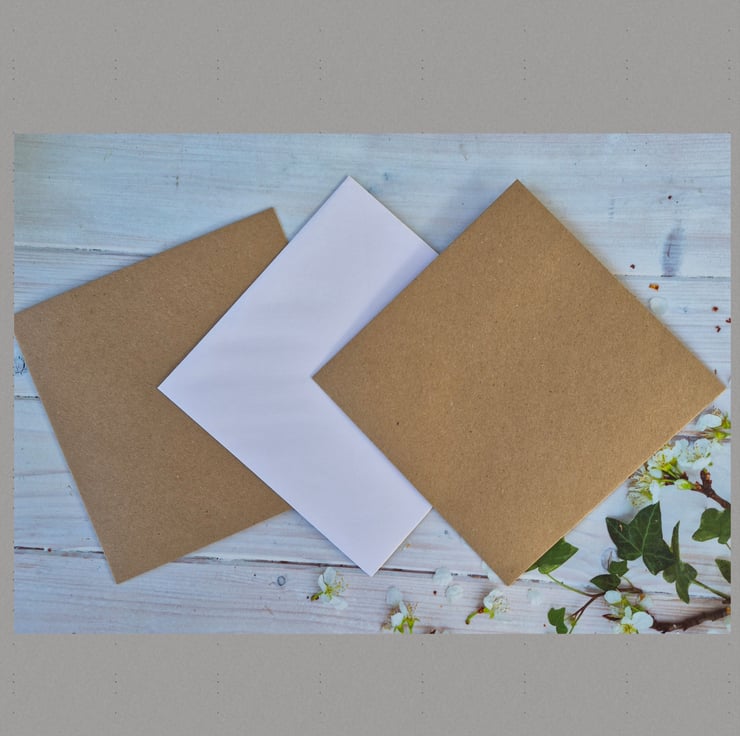6 x 6 ins square with 2 kraft and 1 white envelopes. 15 x 15cms.