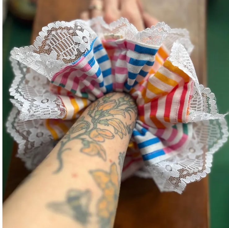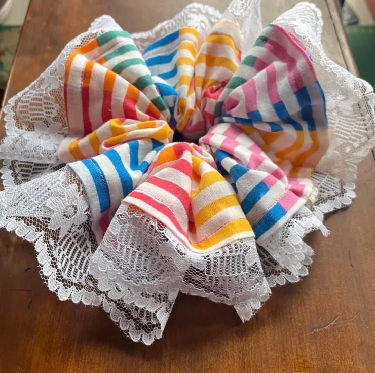 Full of character and gentle movement, it’s perfect for messy buns, high ponytails, or simply worn on your wrist as a sweet statement piece. The mix of colours gives it a playful, homespun feel, while the lace edging adds that delicate, cottage-inspired finish.