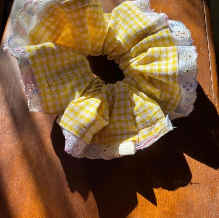 A little burst of sunshine for your hair. This oversized bright yellow gingham scrunchie is full of cheerful charm, finished with soft white and pastel lace for a delicate, vintage-inspired touch.