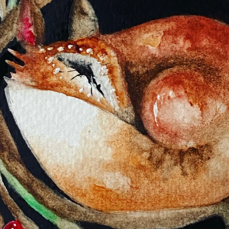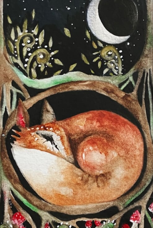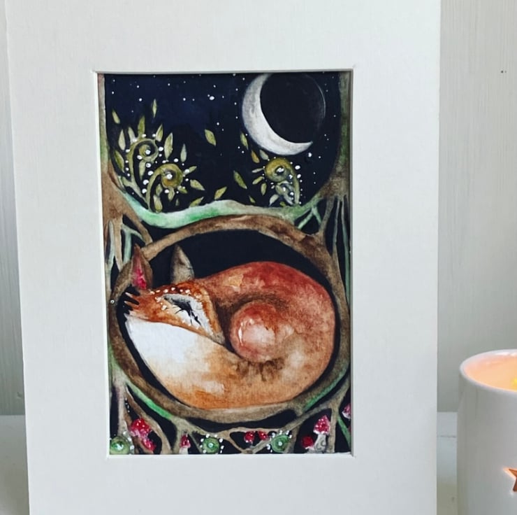 Original Resting Whimsical Fox in Burrow under the Moon Watercolour