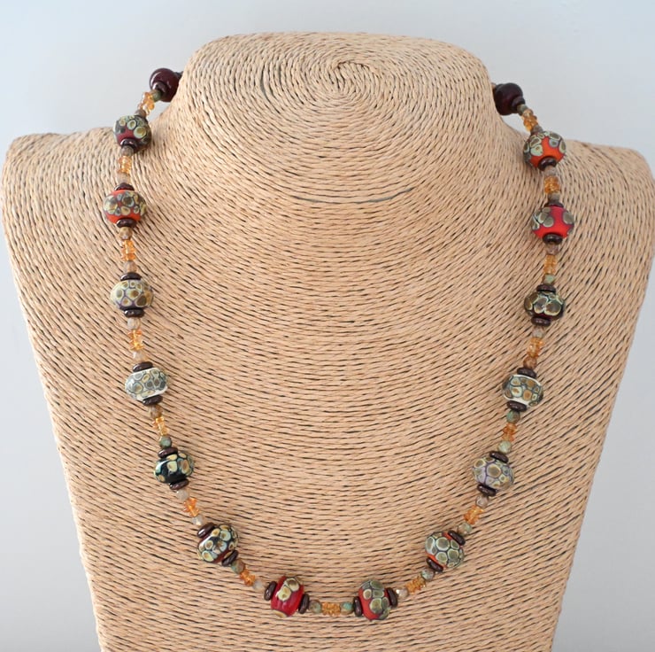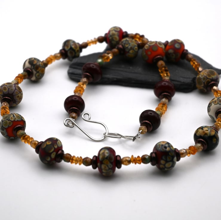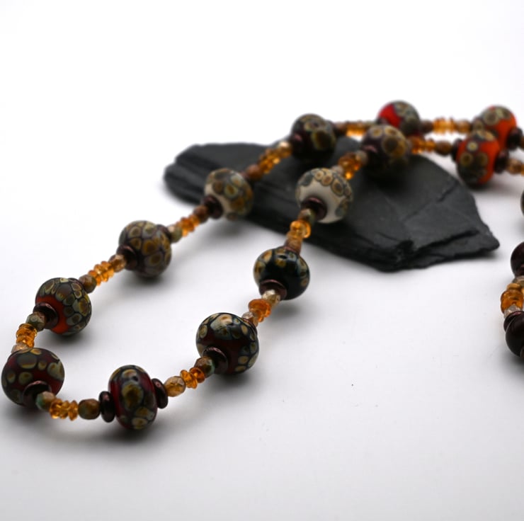 A beaded necklace made with handmade lampwork glass raku beads in various colours, red Czech glass discs and Citrine gemstone beads.