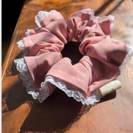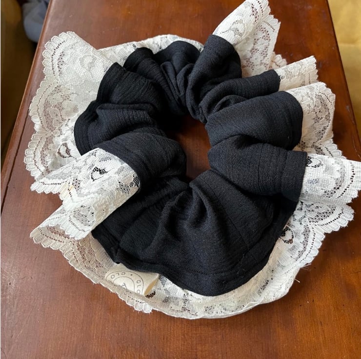 A timeless little treasure with a soft, romantic edge. This oversized black cotton scrunchie is simple and classic at heart, finished with delicate white lace trim for a touch of vintage charm.