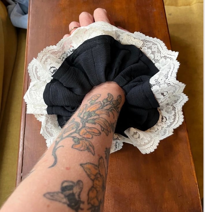 Made from vintage recycled fabric and lace, it carries a quiet story in every stitch. The deep black cotton gives it a bold, versatile feel, while the gentle lace edging softens it with a hint of old-fashioned sweetness.