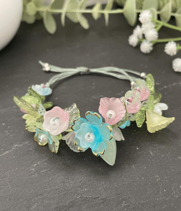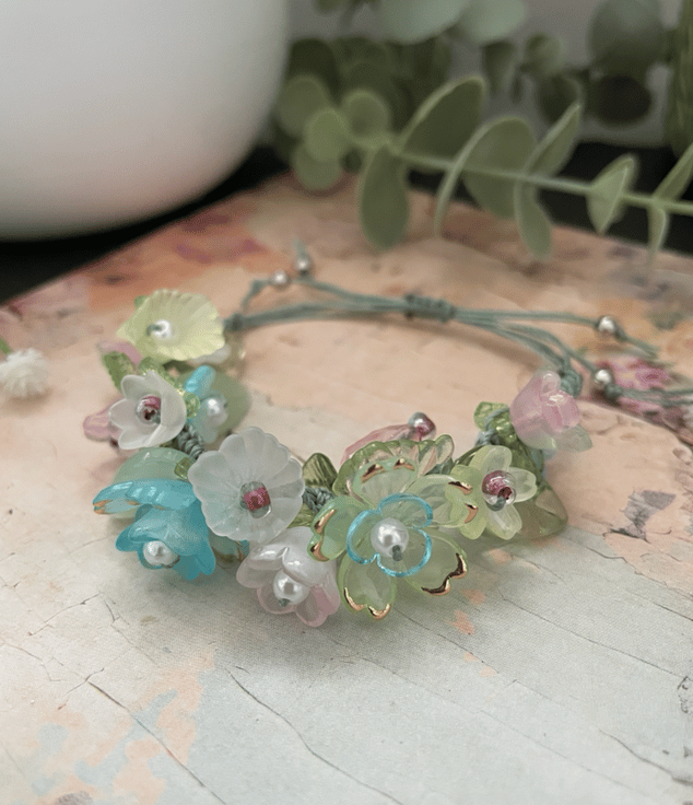 Delicate, feminine, and effortlessly charming this Pretty Floral Summer Garden Beaded Bracelet is the perfect accessory to brighten any look. Featuring beautifully arranged lucite flower and leaf beads together with Czech glass beads, this bracelet adds a soft touch of elegance and color to your everyday style.