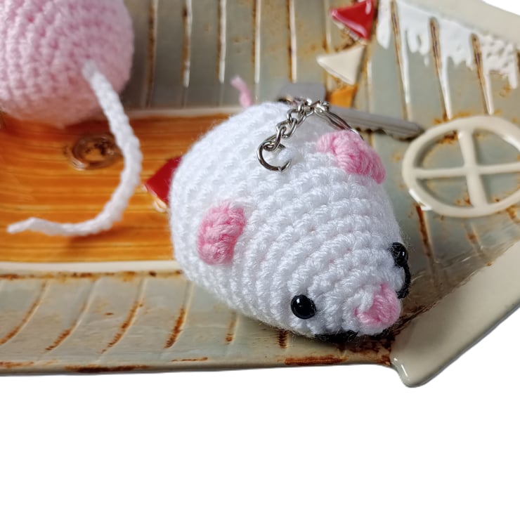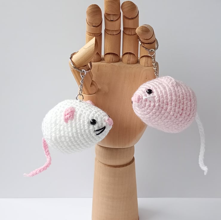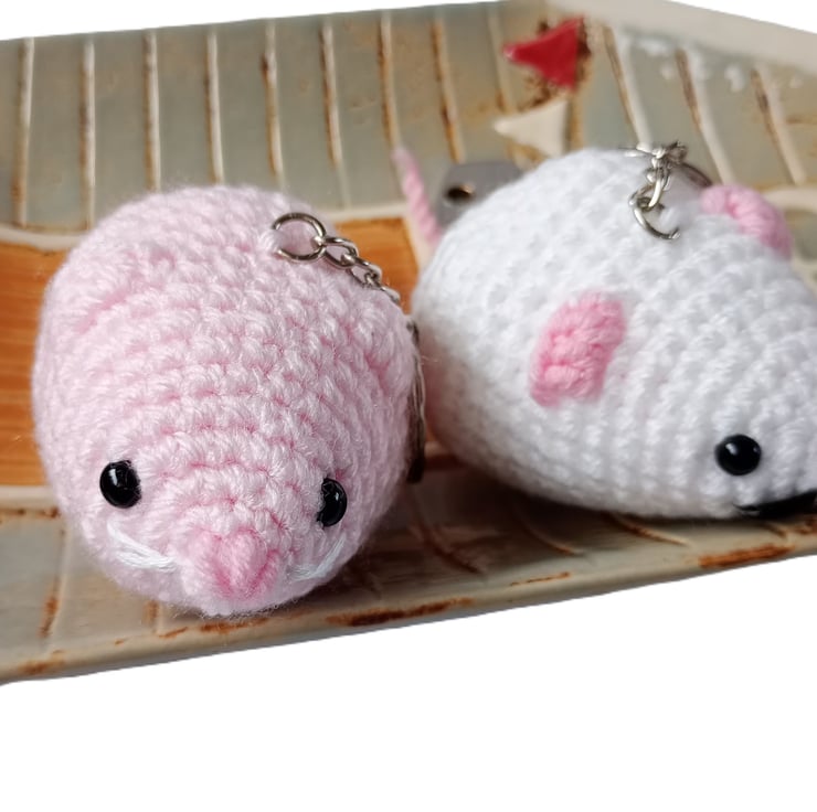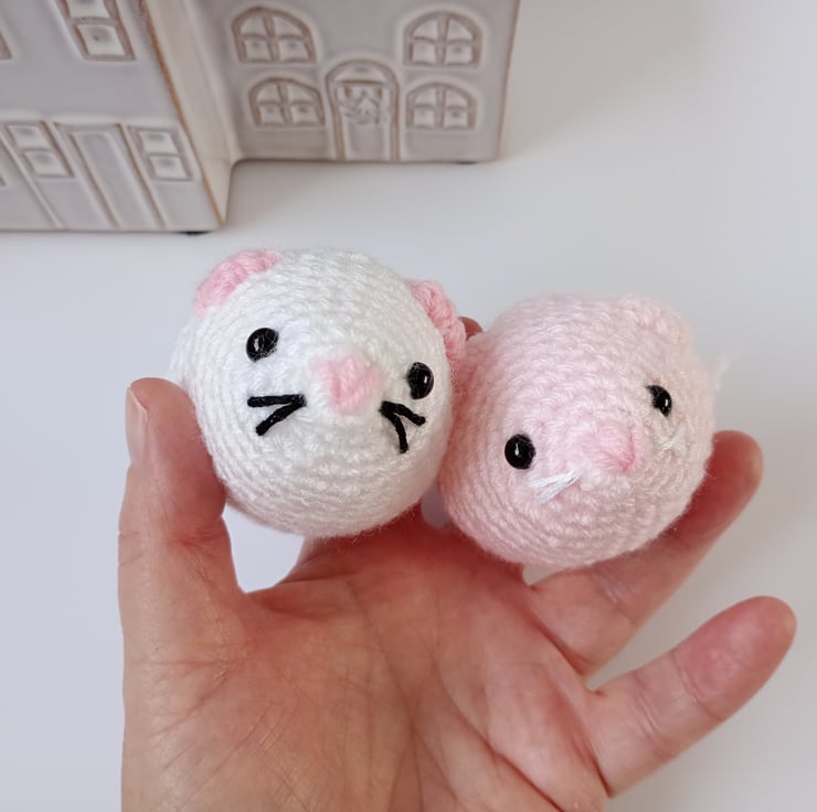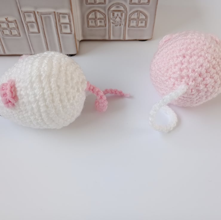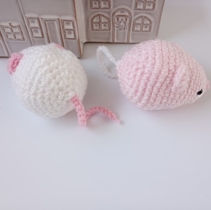 Meet Hem and Haw two sweet "perfectly imperfect" crochet mice. Made to resemble sugar mice, one is in white with pink ears and a pink tail. The other is pink with pink ears and a white tail.