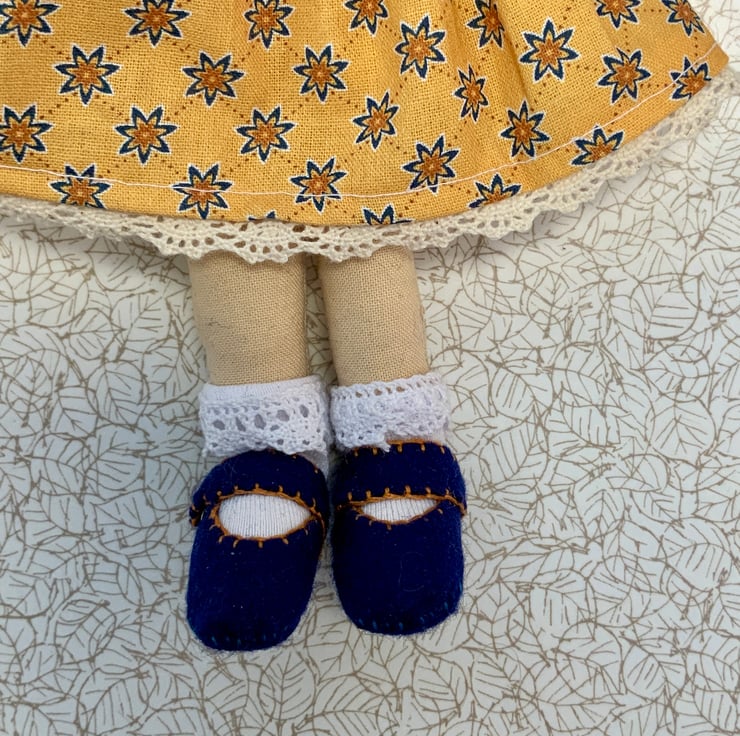 She has a pair of soft cotton knickers and socks with a lace trim to imitate lace socks. Her Navy blue shoes are made from felt and have a snap fastening for better removability.