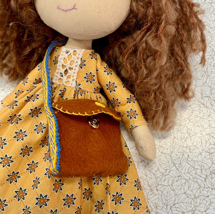 She has a brown felt bag with a colourful cotton strap which has been hand woven on a tablet loom.