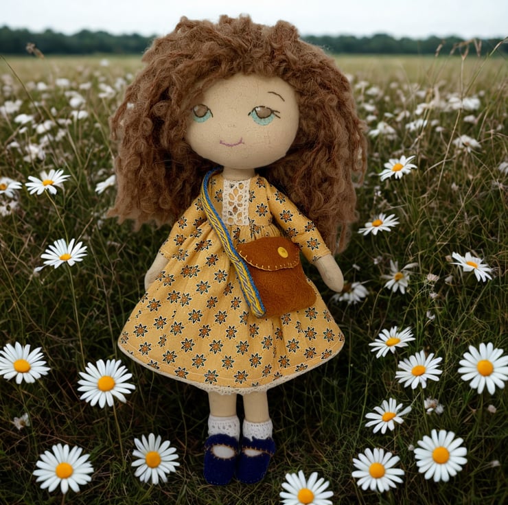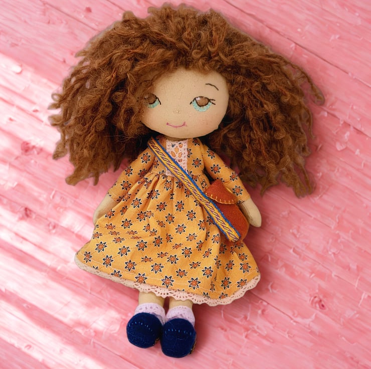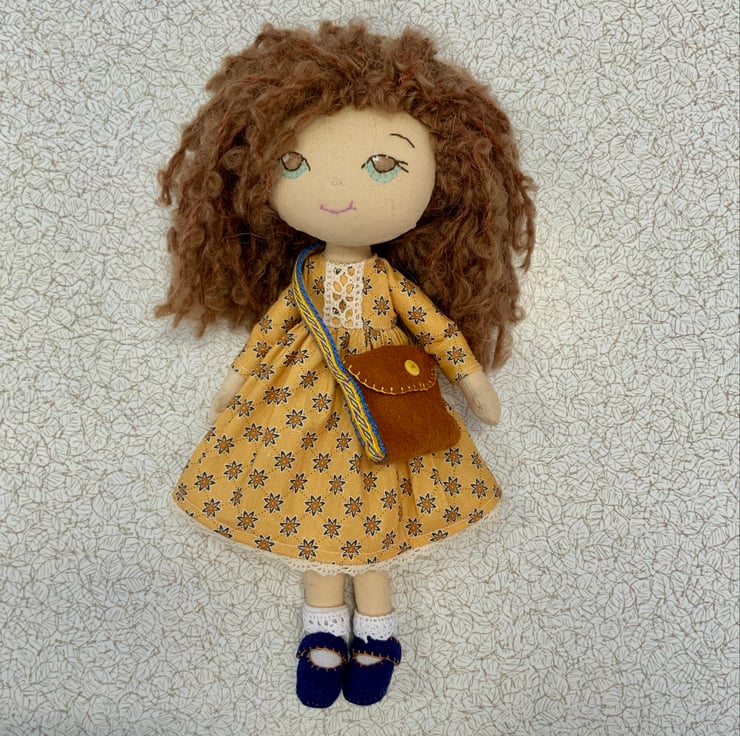 Her dress is a mustard yellow with a lovely pattern and made from cotton. It has lace trimmings and a Velcro fastening.