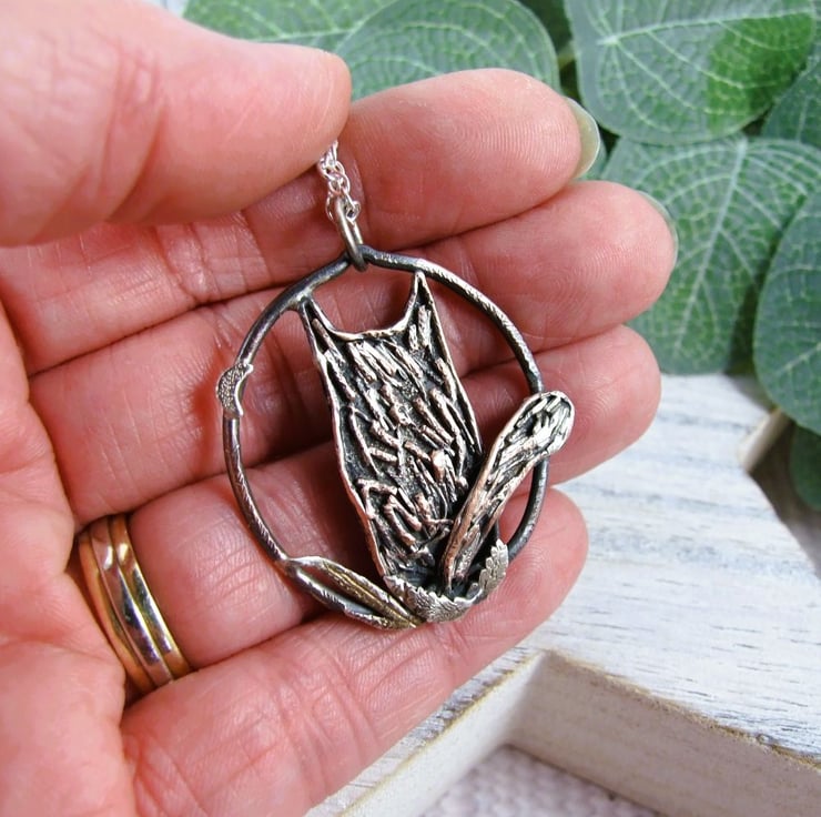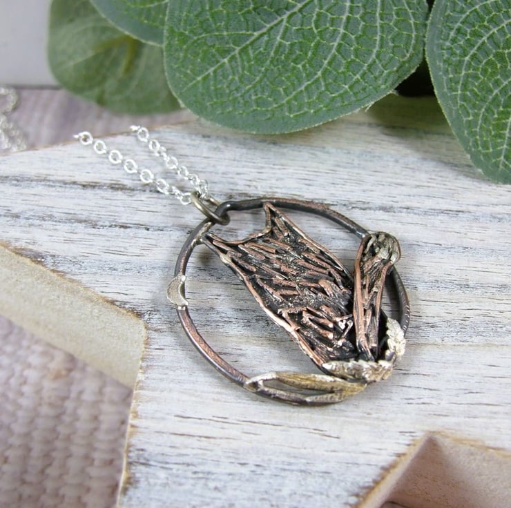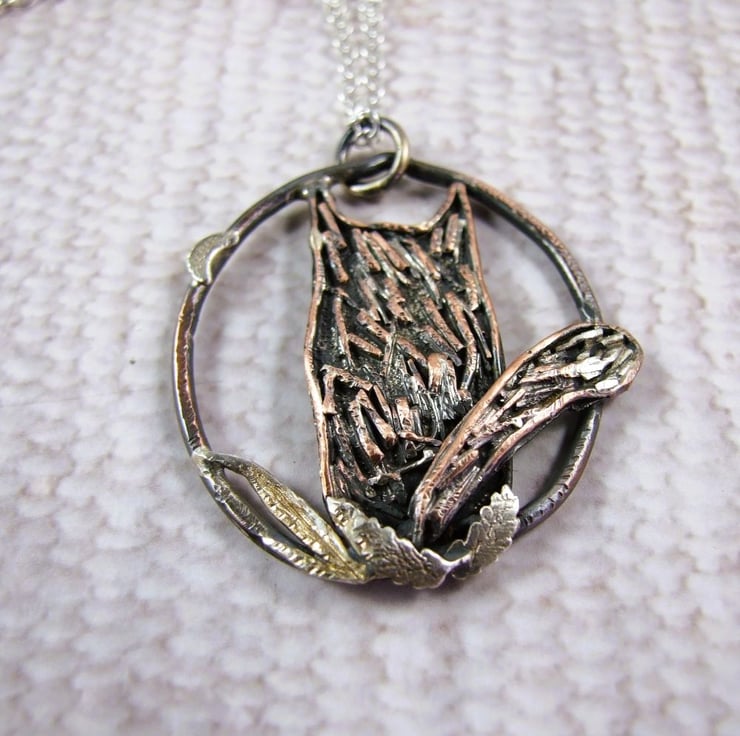 I began by hand drawing the fox shape on copper and cutting out, then I added the outline and filled the fox with many tiny hand cut lengths of silver and copper wire all soldered in place to create the fur effect. I have sat the fox in a copper circle adding a tiny silver moon and leaves and suspended from an 18 inch sterling silver chain. Finished with an antiqued patina to bring out the different textures.