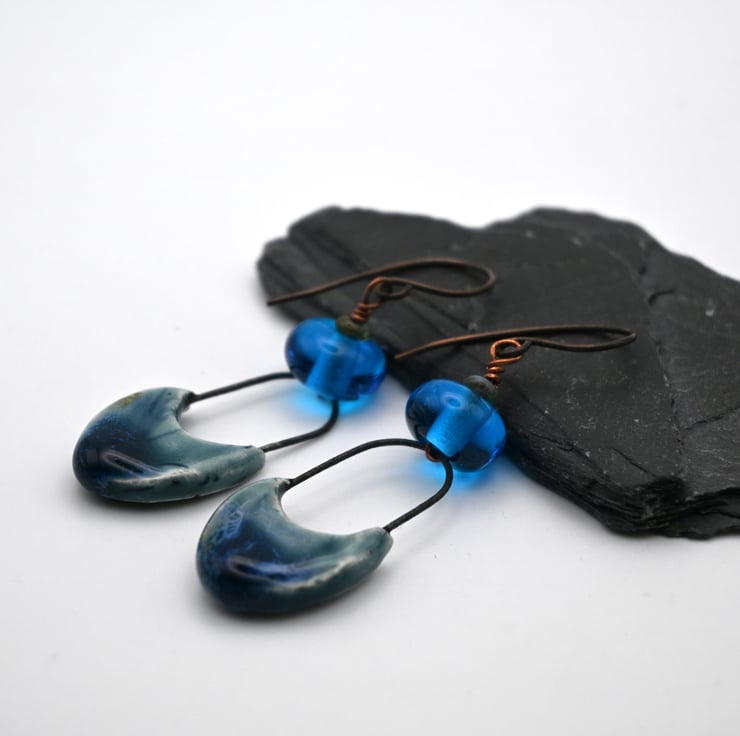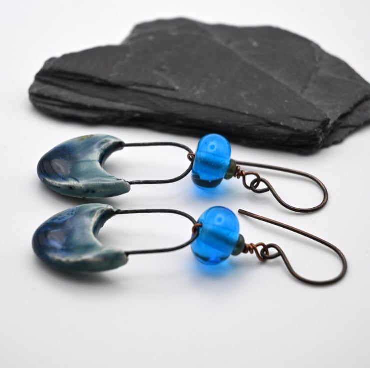 A pair of copper earrings made with blue handmade lampwork glass beads and blue handmade ceramic drop charms.