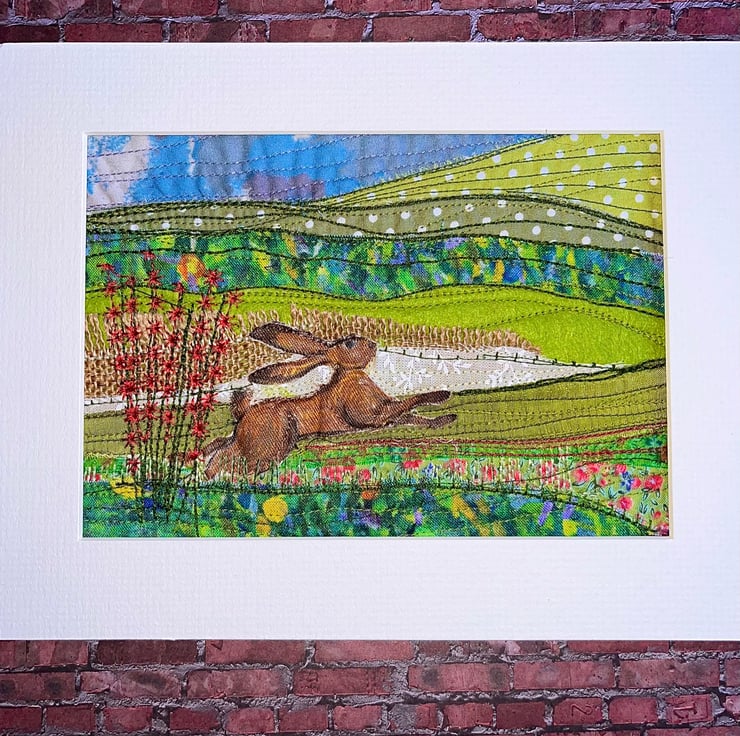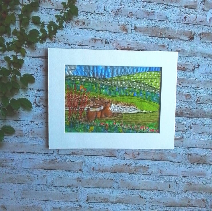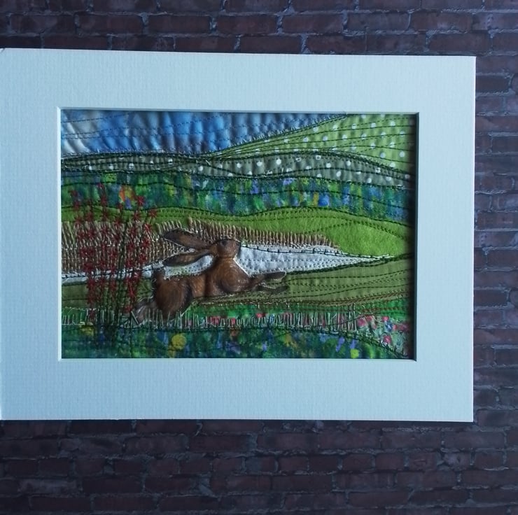 Fabrics layered and machine stitched form the basic background to this landscape. A hare , painted onto fabric is stitched on .