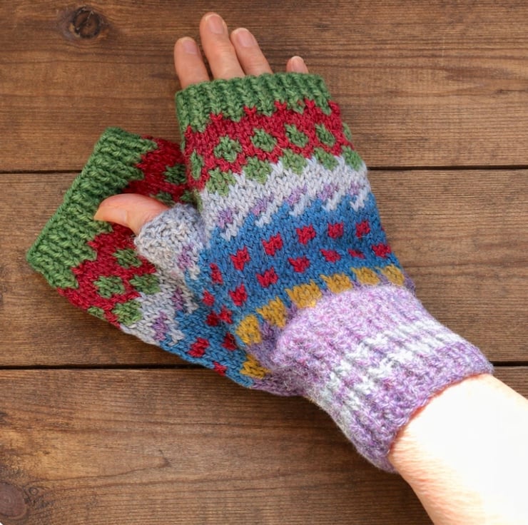 These colourful hand knitted fingerless gloves are created using a 65% wool 35% Alpaca Dk weight yarn. They are an adult size measuring 21cm from the top of the gloves to the bottom and they are 11cm across the palm area. Like most knitted garments there is some stretch in these gloves. Soft and warm they are ideal for cooler days whether you are walking your dog, enjoying the outdoors or just on your way to work. Hand wash in a cool wash.