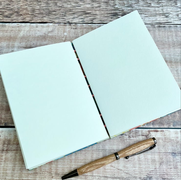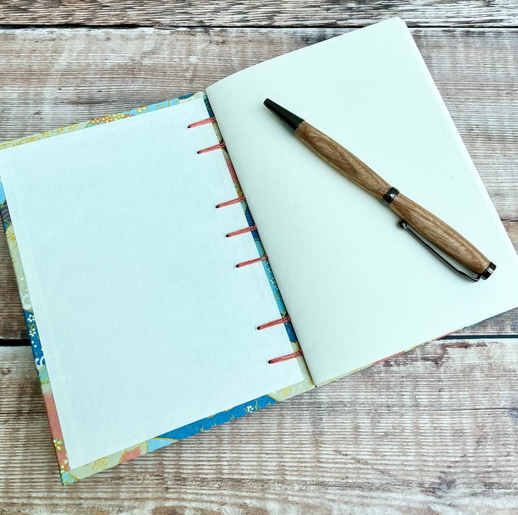 There are 50 pages (100 sides) of responsibly sourced 120gsm ivory paper, suitable for all writing and drawing mediums. The paper is folded into 5 sections. These are then stitched together to create a beautiful exposed spine binding which allows the book to rest completely flat when open.