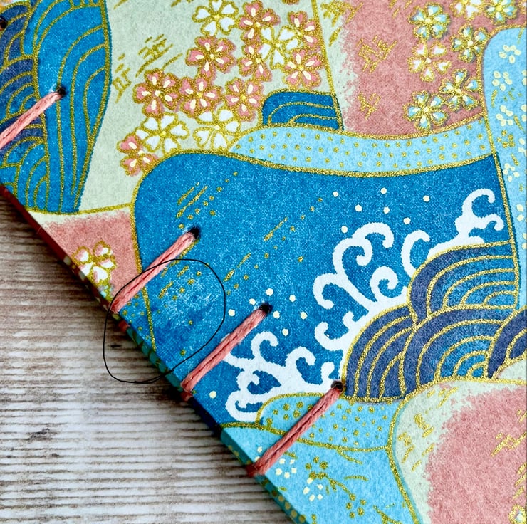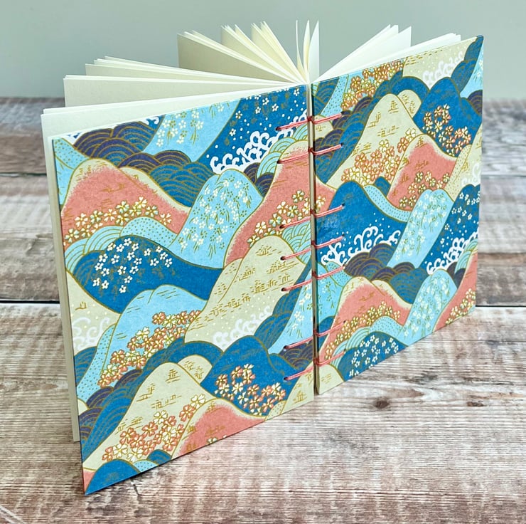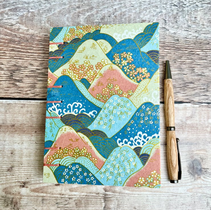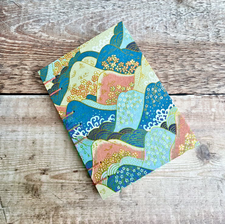 This Perfectly Imperfect A6 journal sketchbook is covered with a pretty rolling hills Chiyogami paper and is bound using Coptic Stitch.