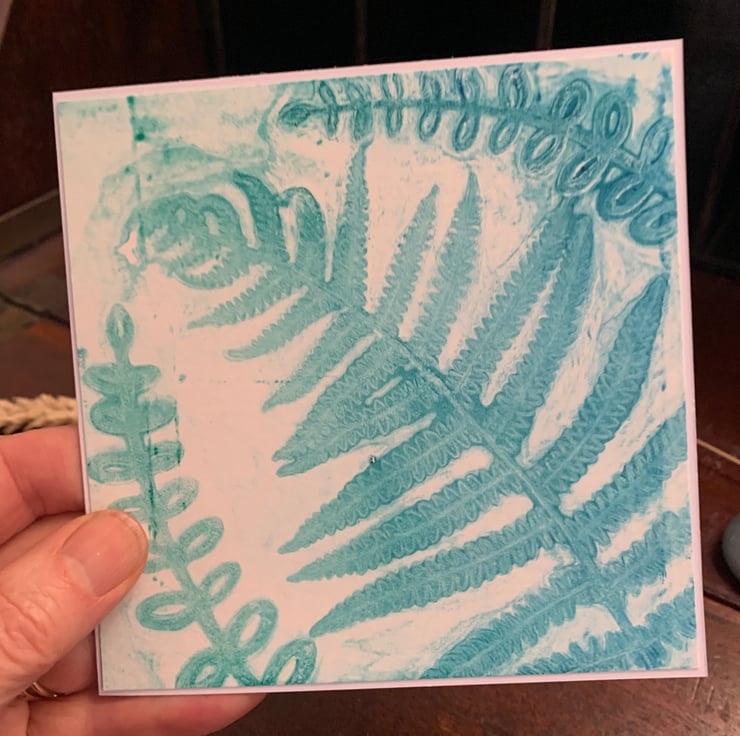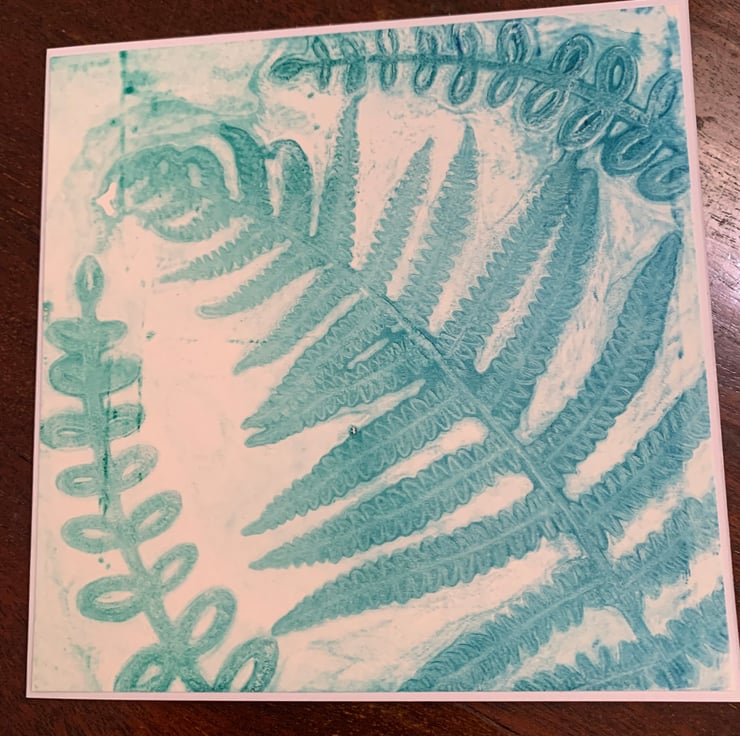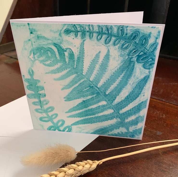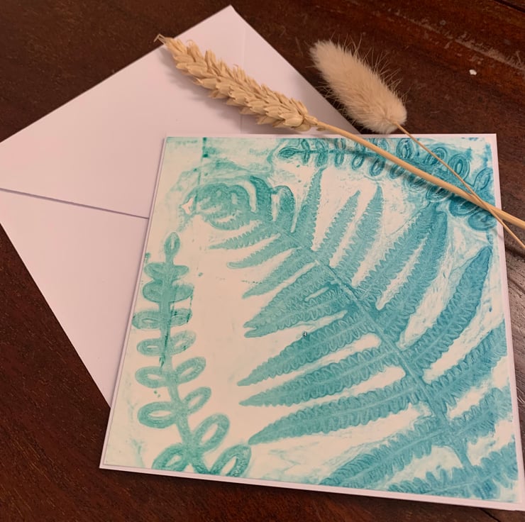 This one of a kind gelli print card was created using a fern leaf and stencils that were pressed onto a gelli plate loaded with teal ink. Excess ink was taken away, then the leaves removed revealing their intricate patterns. I then printed the image onto white paper which is mounted onto a blank 5'x5' card.
