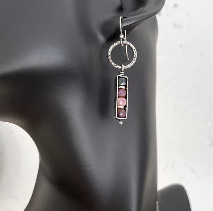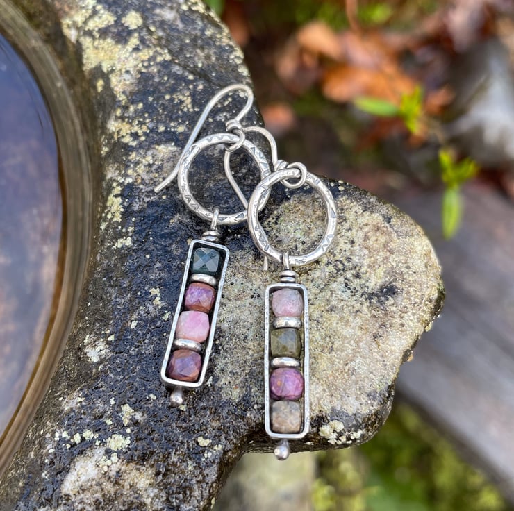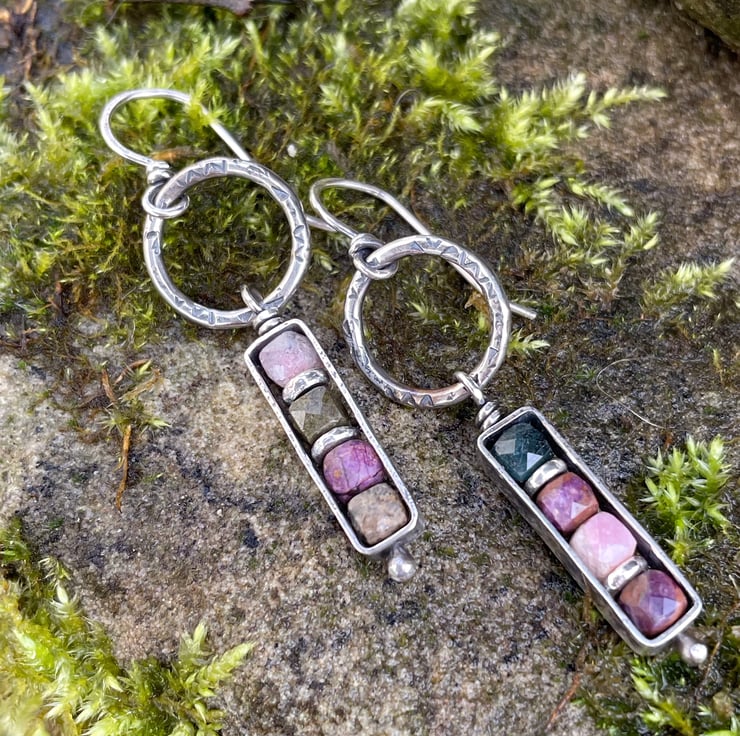 The silver has been textured with hammers and punches, and has been oxidised to give a weathered, aged look. The beads I’ve chosen are faceted cubes in dusky, earthy pink and olive green shades. There are 4 gemstone and 2 silver beads to each frame.