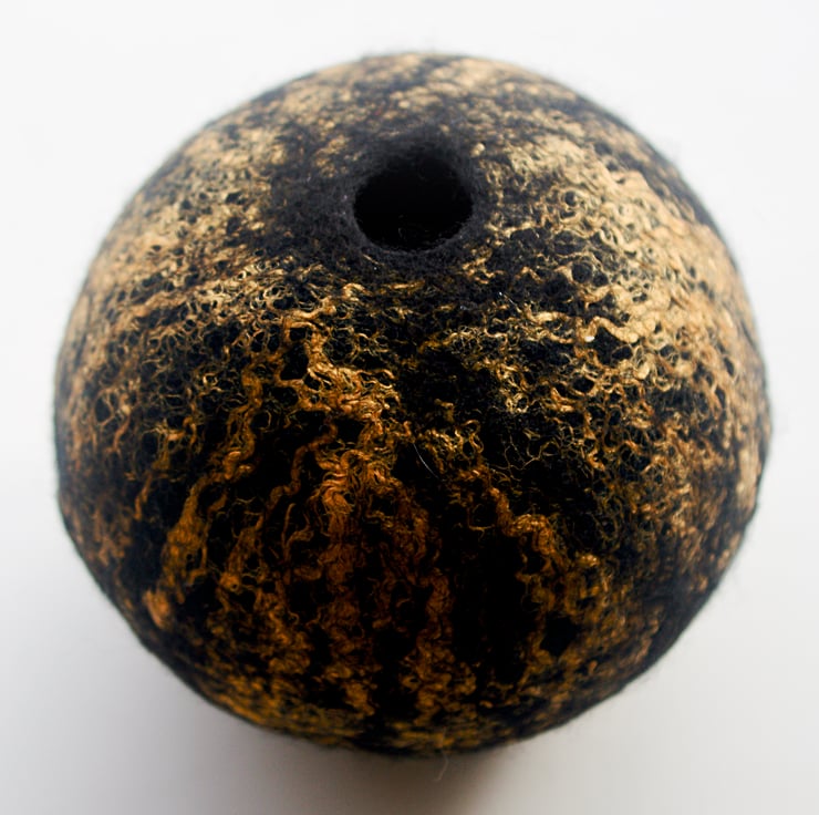 Created by me, using black Merino wool with tangy orange Mulberry silk which I have wet-felt by hand into a sturdy bowl with a lovely neat small opening.