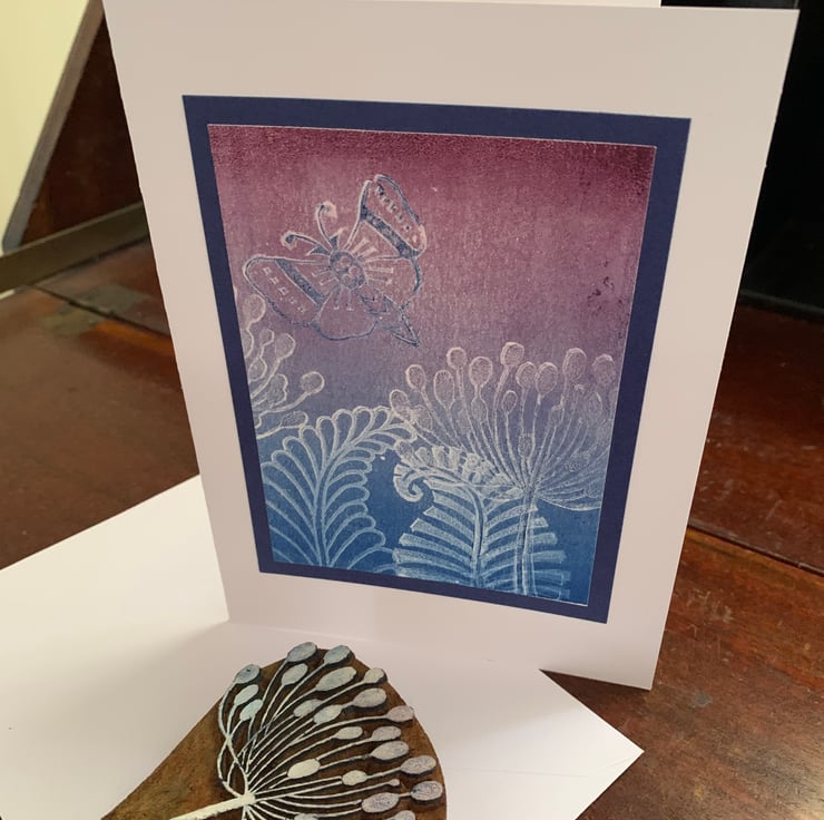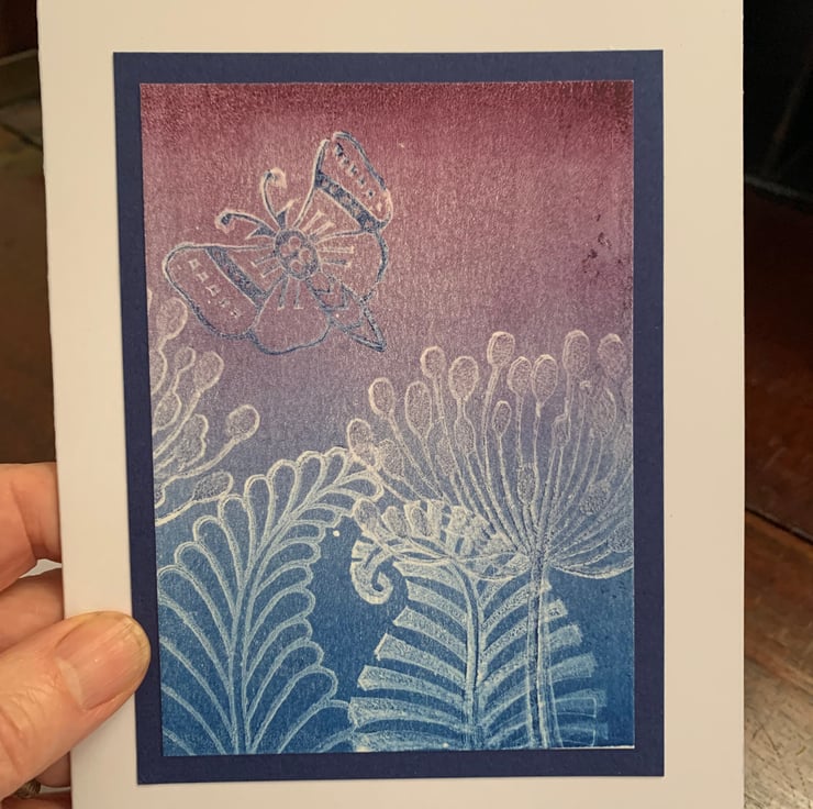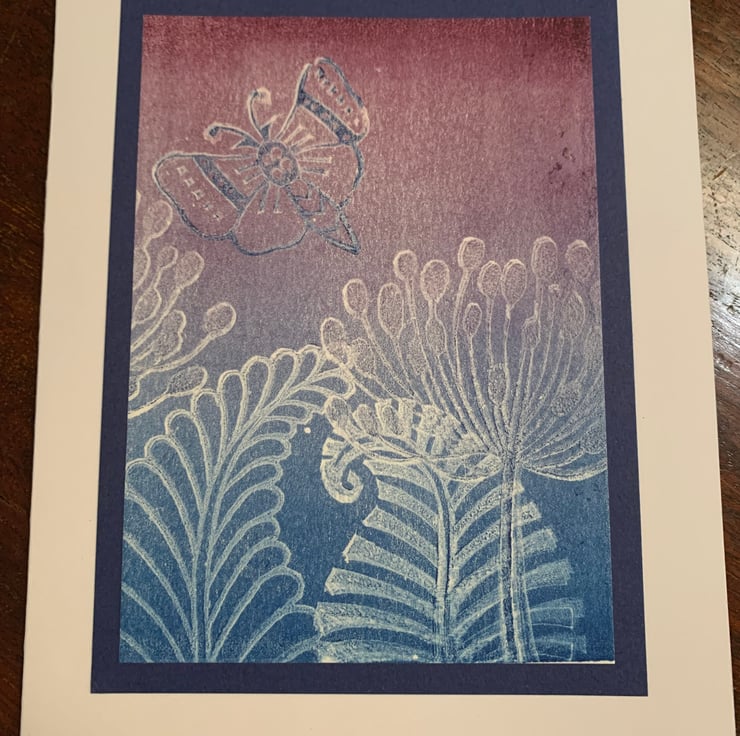 Printed using a gelli plate and purple to blue ombre effect. The print is mounted on blue card and presented on a white card measureing 5'x7'.