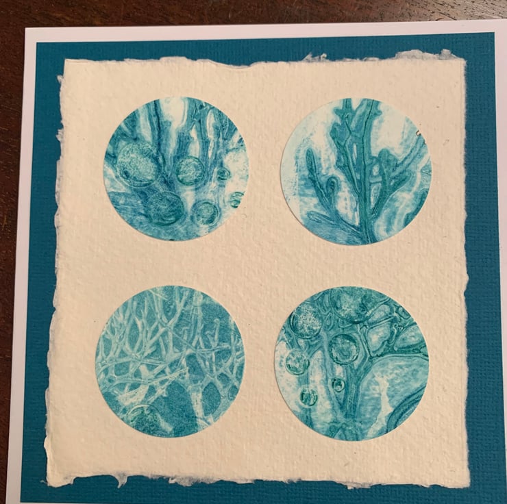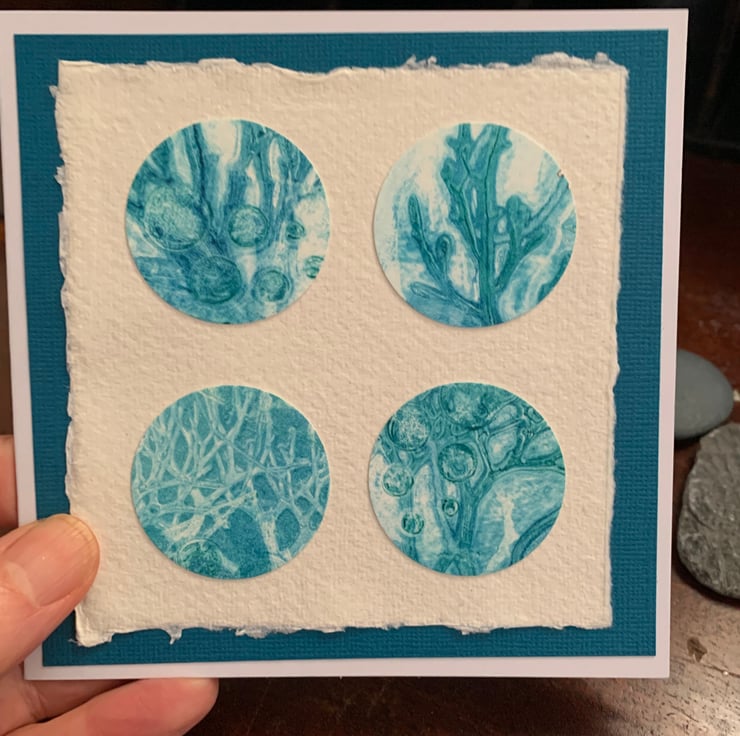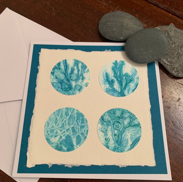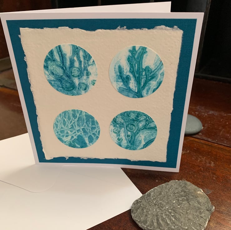 A beautiful original gelli print card featuring circles of seaweed collected from Lyme Regis beach. I used blues and greens to create an ombre effect when printing with the seaweed on a Gelli plate.