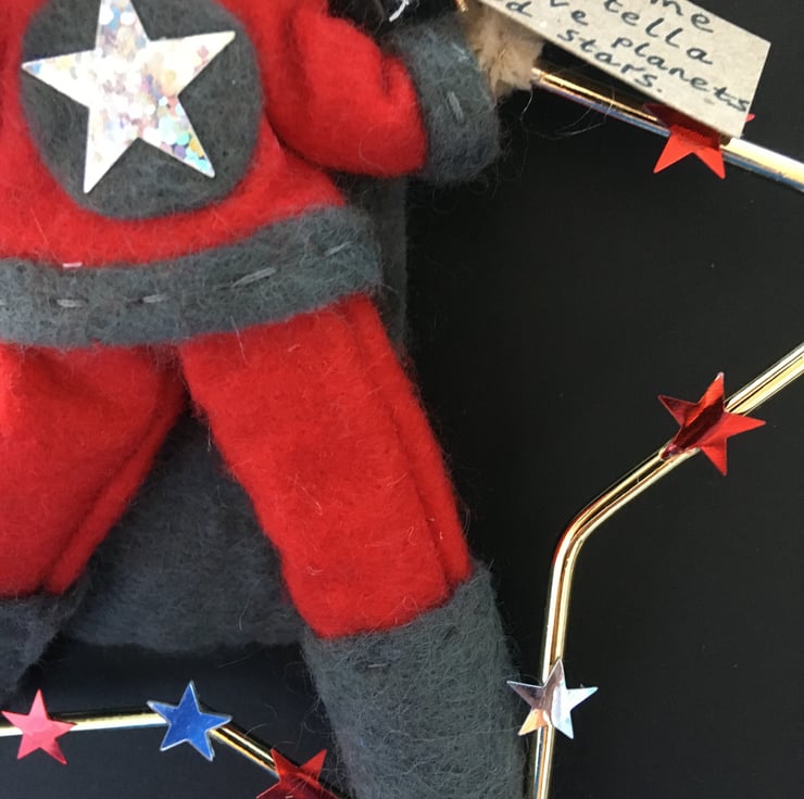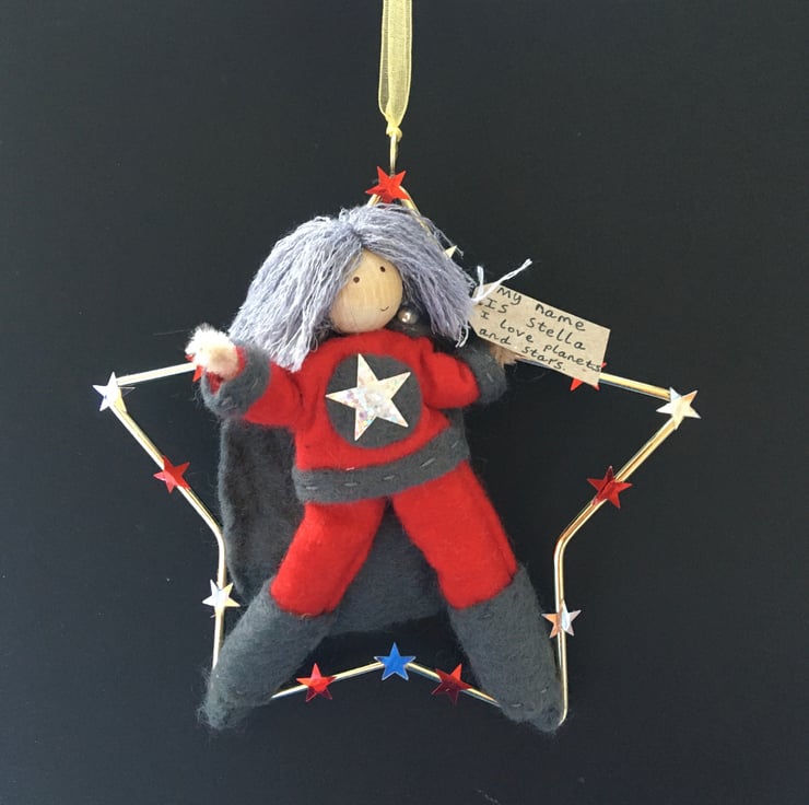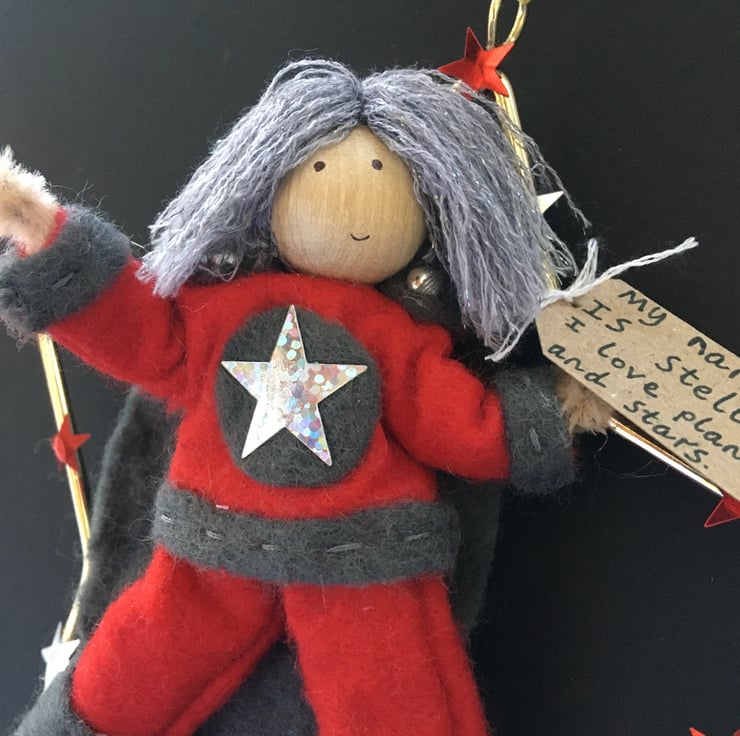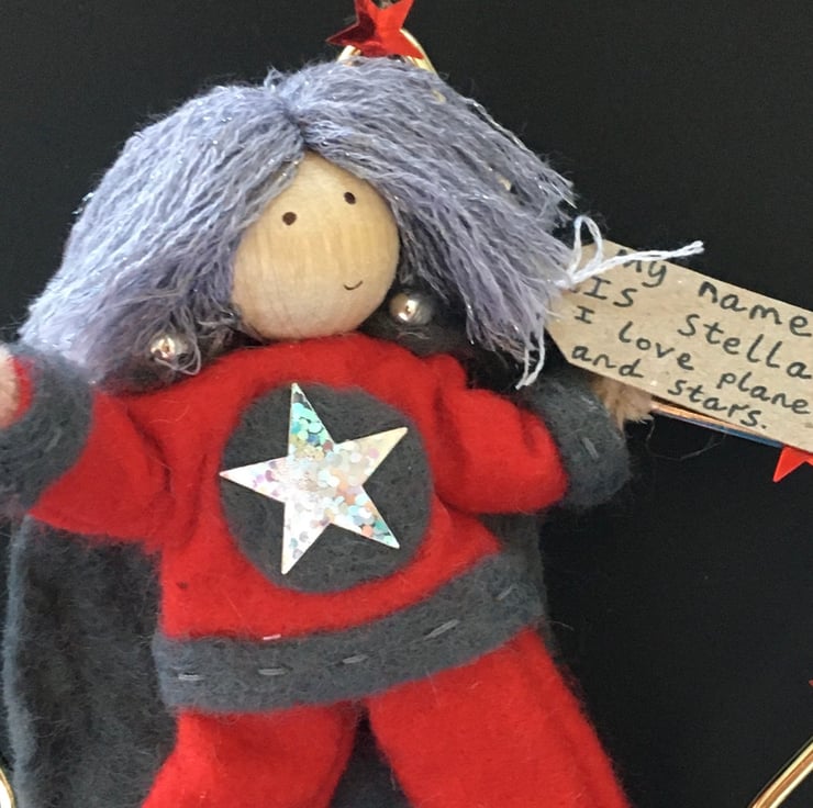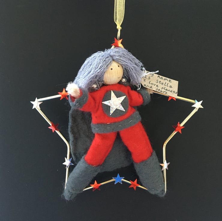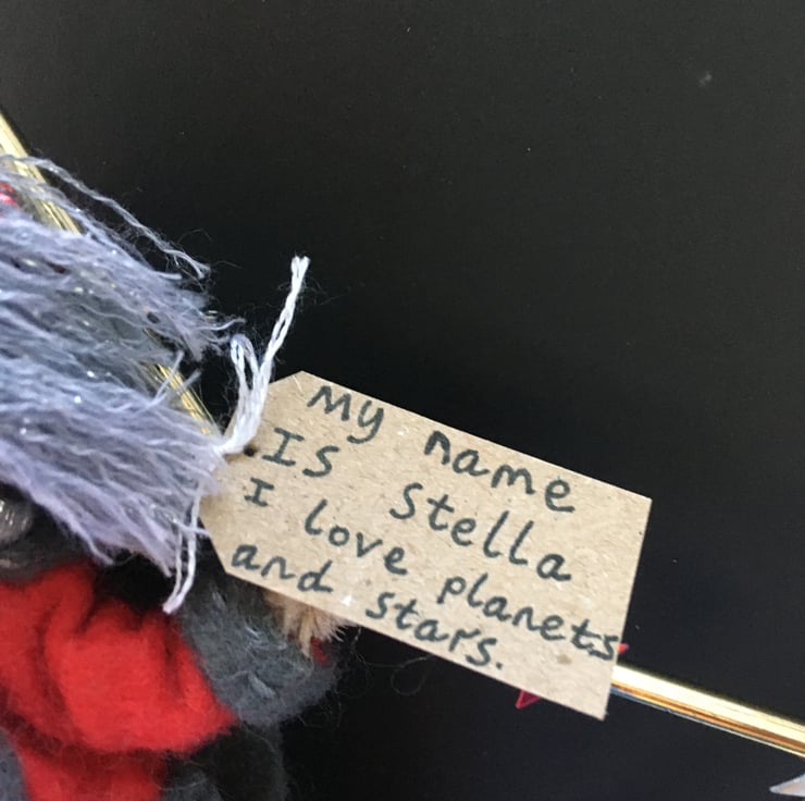 She has a tag with her name on and something that she loves. This superhero is called Stella, and she loves planets and stars.