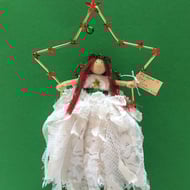 She has sparkly embroidery thread hair, and a wooden bead head with carefully hand draw features which give her a unique expression.
