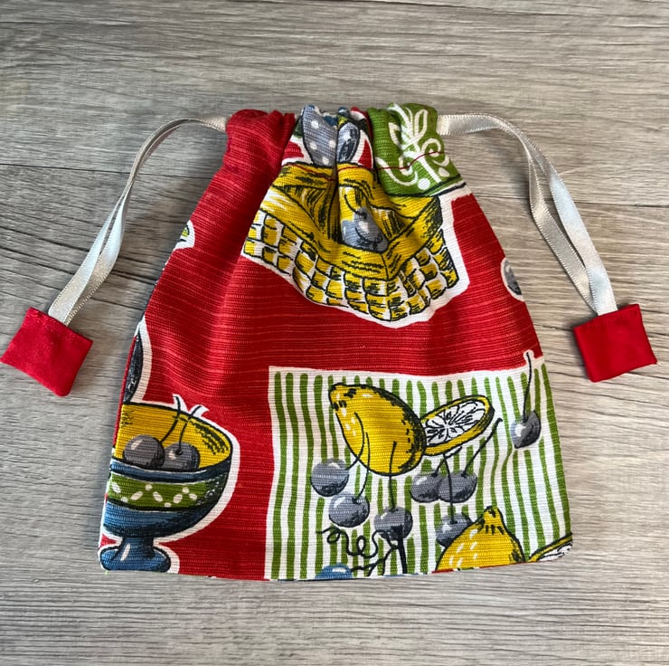 This little bag is one of three I have made from delightful vintage 1960s fabric that features kitchenalia and some juicy looking fruits! I am listing each bag separately as the bags show different things depending on the pattern placement.