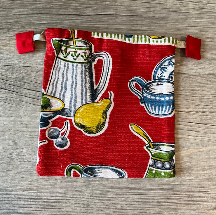 Red Drawstring Bag Vintage 1960s Kitchenalia Fabric