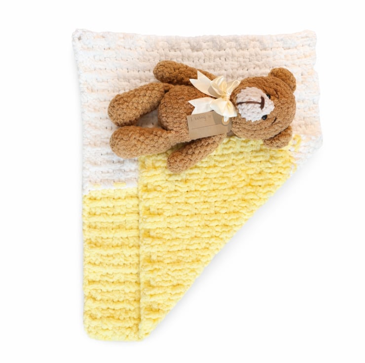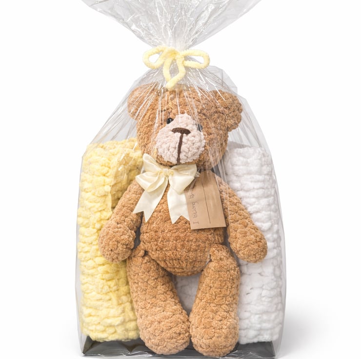 Meet Biscuit the Bear, a lovingly hand crocheted keepsake presented as a beautifully coordinated gift set within the Heartspired Creations Gift Collection. Designed to comfort and be treasured, Biscuit arrives with a soft chenille blanket in gentle yellow and white tones, creating a thoughtful handmade gift perfect for welcoming a new arrival.