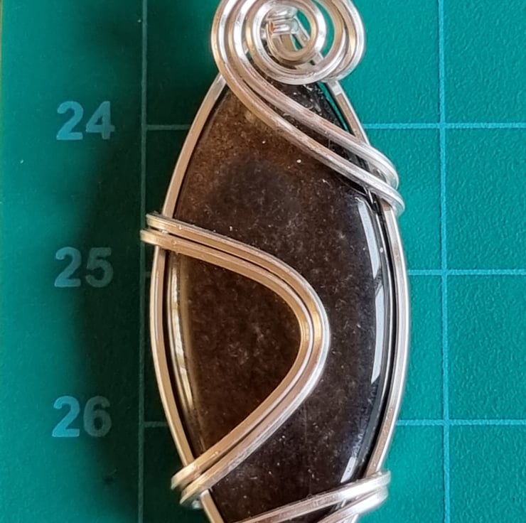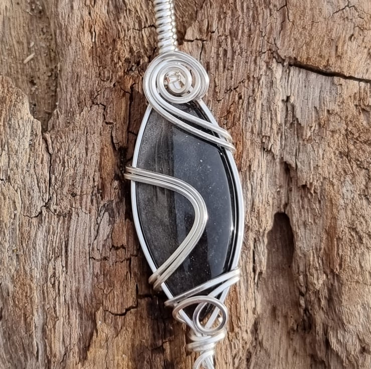 A sweeping, swirl design wire wrap on this beautiful silver sheen Obsidian in a marquise shape. Hand wrapped in silver plated wire,