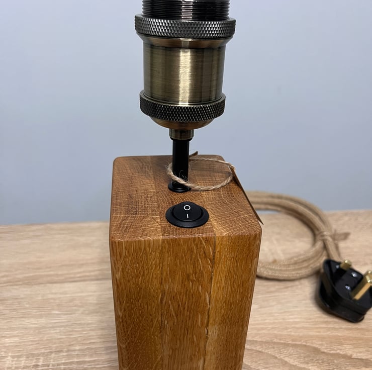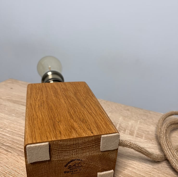 This handcrafted oak lamp is made from carefully selected solid oak planks, cut and precisely glued together to form a striking wooden block. Each piece is individually made by hand, celebrating the natural beauty, grain patterns and character of real oak.