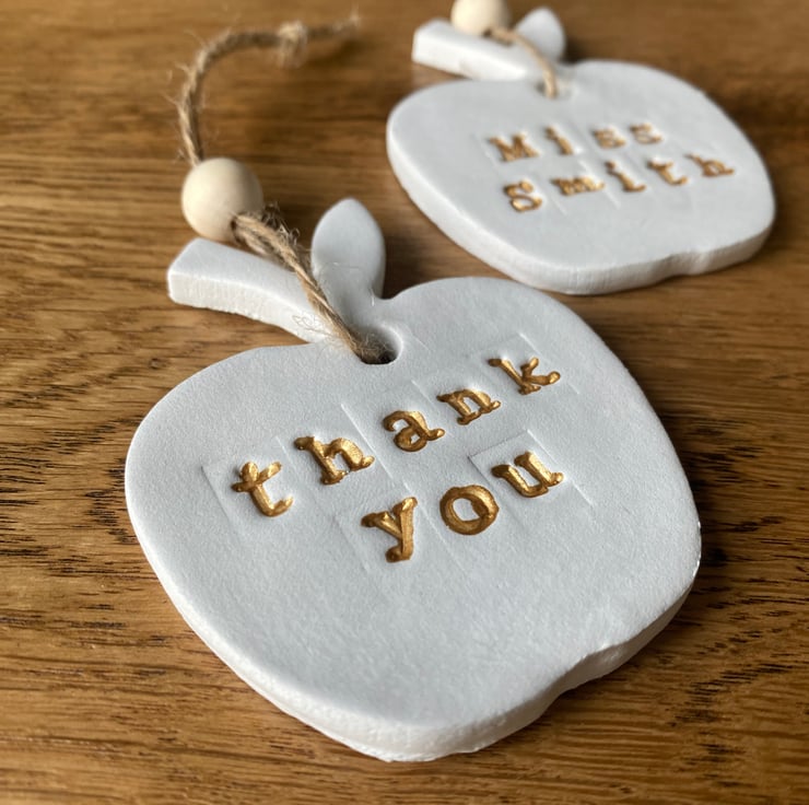 Hand stamped with your teacher’s name or ‘thank you’ , painted in gold, tied with twine and a wooden bead. Please provide the name or message required when ordering.