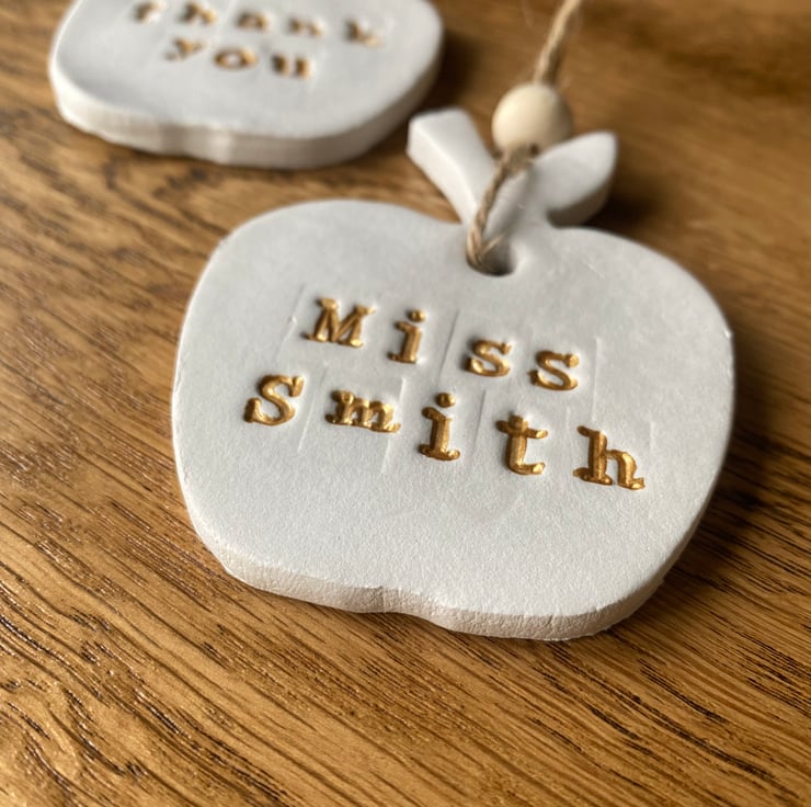 A handmade clay keepsake made using air dry clay, twine and a wooden bead, in a minimalistic Scandi style. An ideal gift for teacher’s with a personal touch.