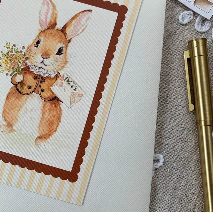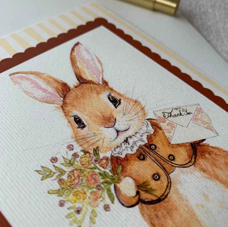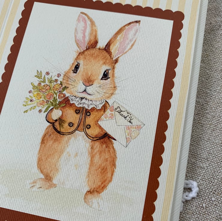 The design shows a bunny dressed up elegantly, holding a colourful bouquet of flowers and a thank you letter – perfect for saying thank you as the card reads that message at the front.