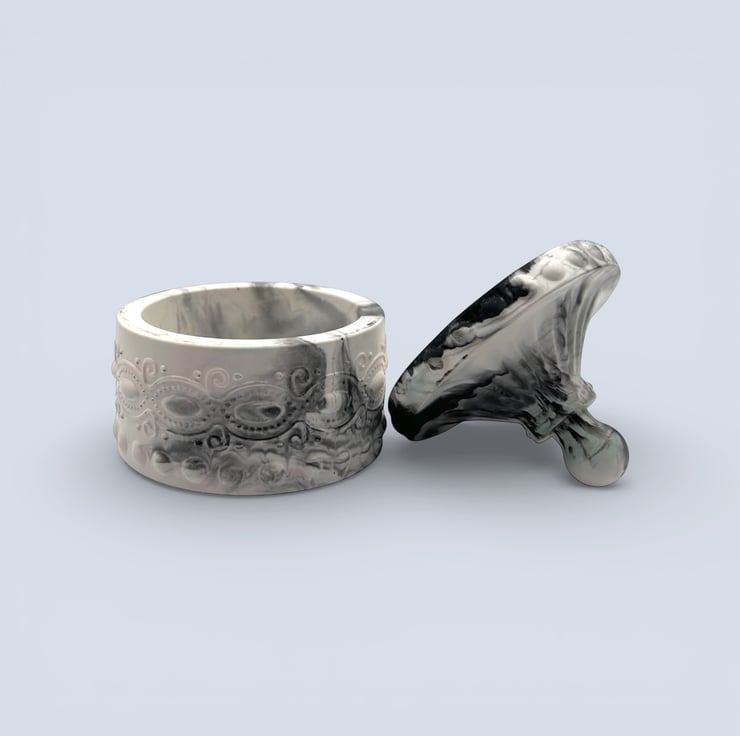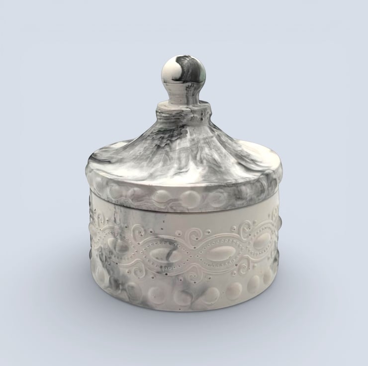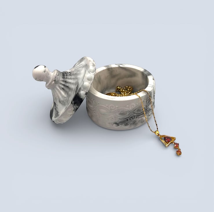 This design was inspired by the quiet strength and elegance of natural marble, where soft grey tones are traced with darker charcoal veining formed over time. I wanted to capture that sense of depth and permanence in a smaller, tactile piece. The flowing stone-like pattern moves organically across the surface, while the raised detailing adds structure and balance. The result is a jewellery box that feels sculptural, timeless and quietly refined.
