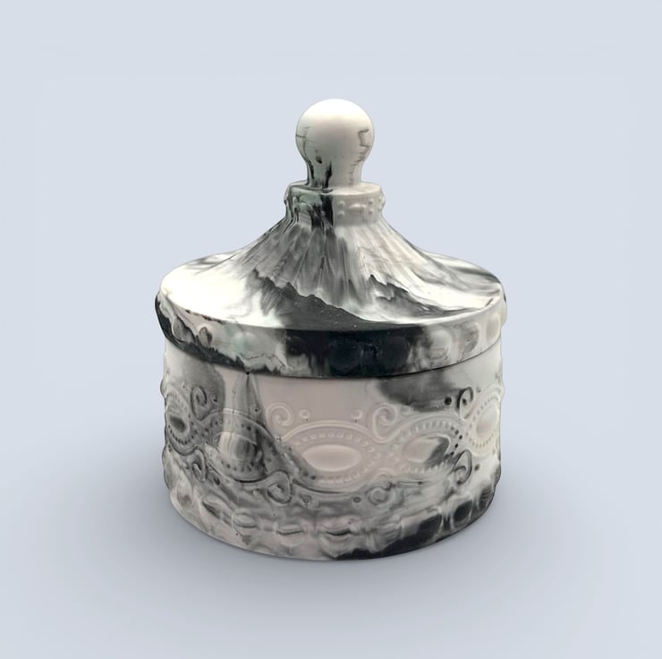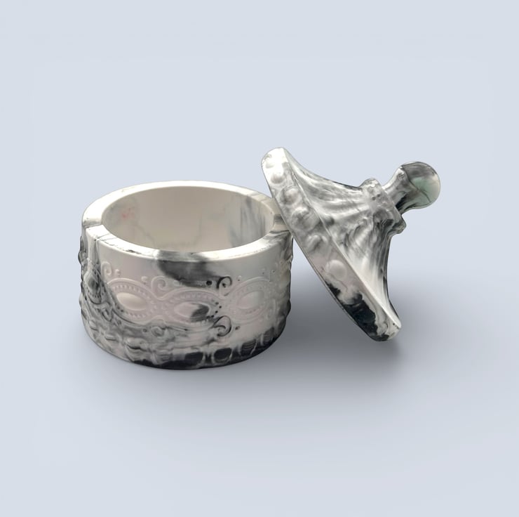 Each piece is handmade in my home studio from a water-based mineral material with a smooth, stone-like feel. The marbling is created by hand, so no two boxes will ever be the same. Subtle air bubbles and slight colour variations are part of the handmade process and add to its individuality.