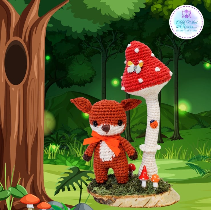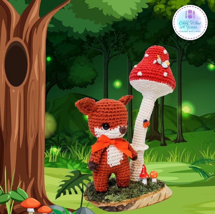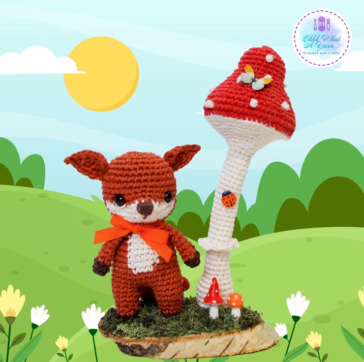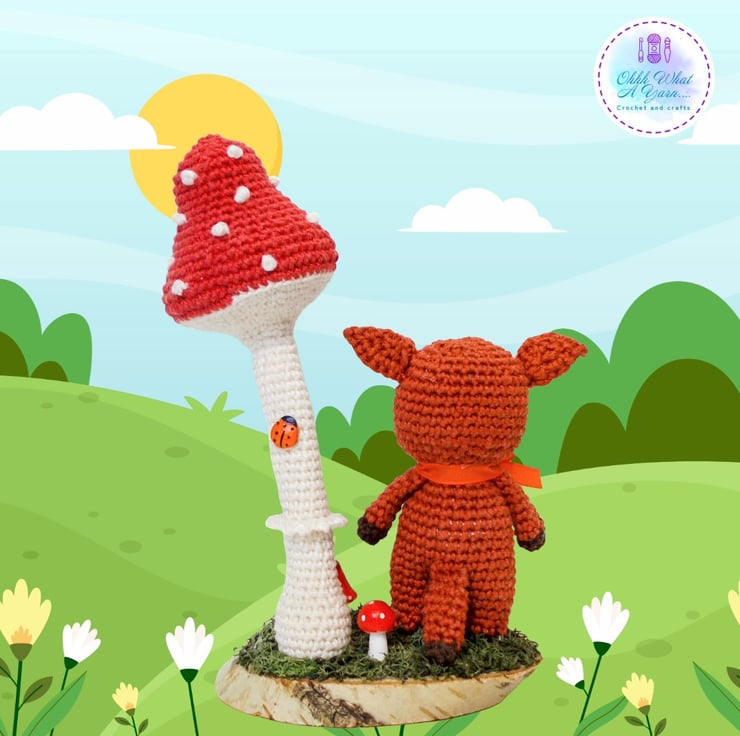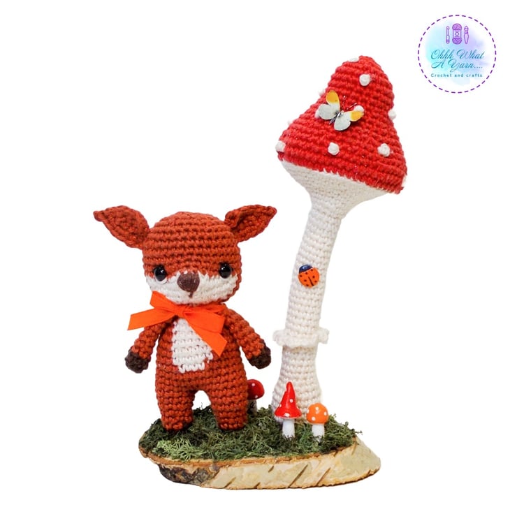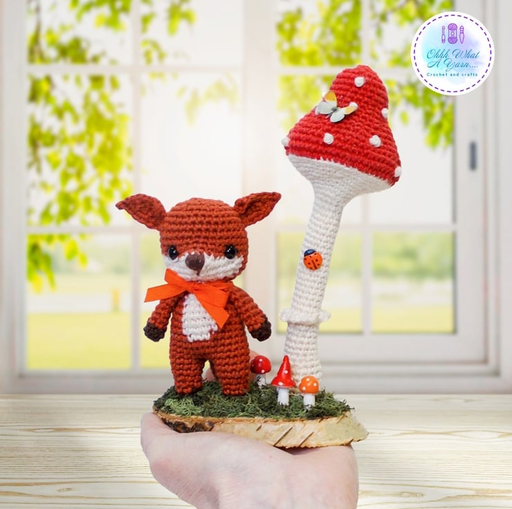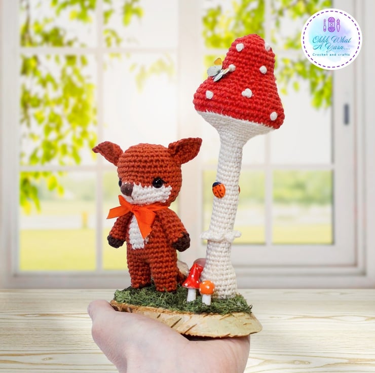 Ferdy is standing beneath a wired crochet toadstool that can be gently adjusted into different positions. They are both fixed to an oval log slice which I have decorated with hand painted air dry clay toadstools and reindeer moss. I have added some little clay ladybirds to the toadstool and a gorgeous mini butterfly.