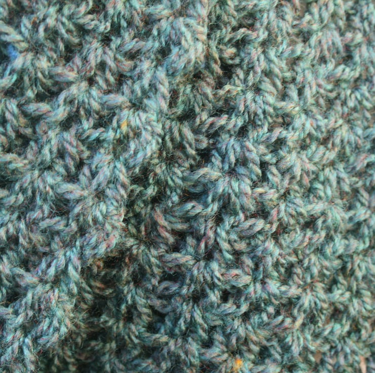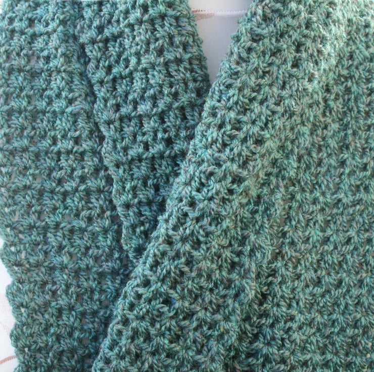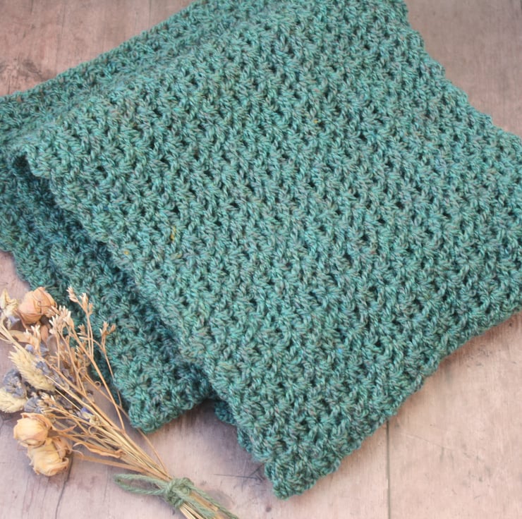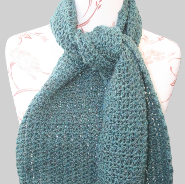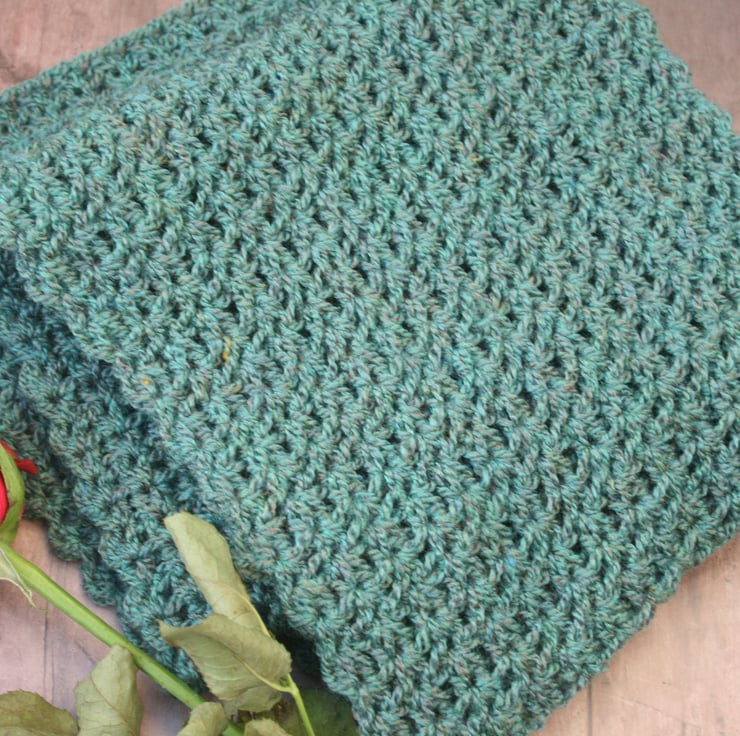 A lovely Highland Heathers green (Bracken) tweed-effect crocheted scarf, soft and warm and ideal to wear at home and outside. It is quite a versatile colour and could be worn with different outfits. Made with kind permission of the original pattern designer.