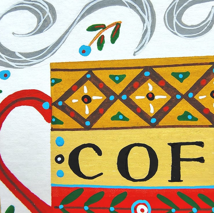 The ideal painting for anyone who finds joy in their morning brew of coffee this features two whimsical, patterned coffee mugs. Swirls of steam and a touch of folk art foliage make it the perfect gift for coffee lovers!