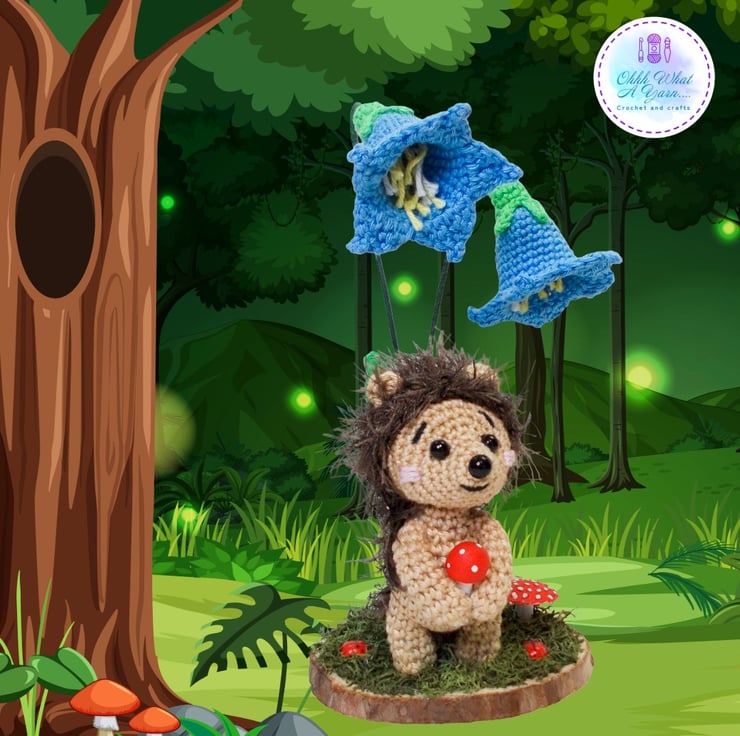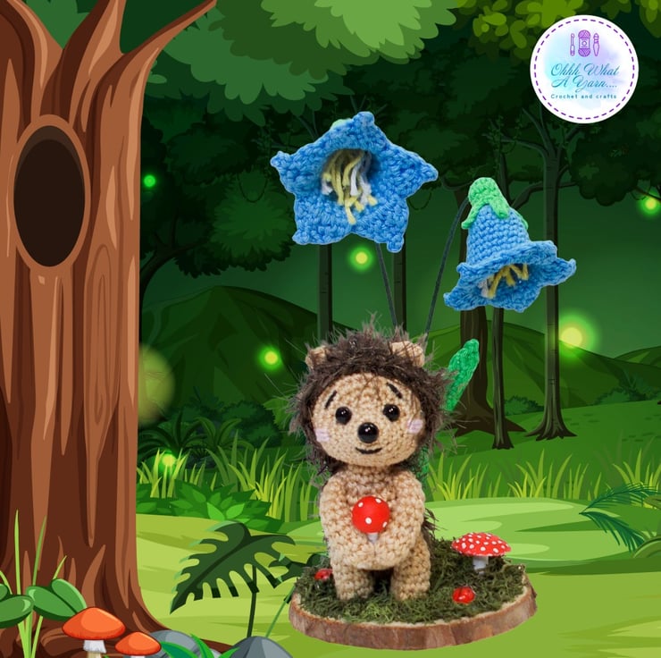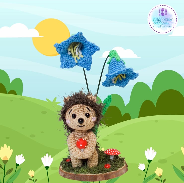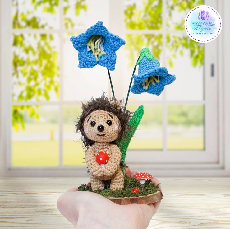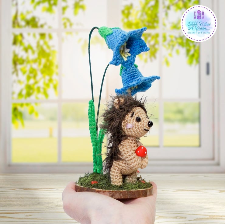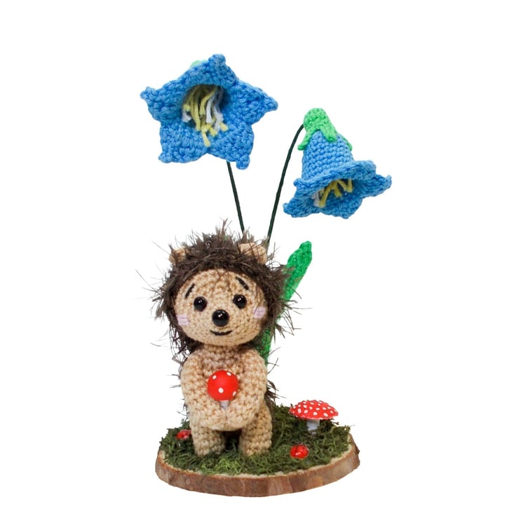 Crochet hedgehog and bluebells sculpture. Hedgehog ornament. Hedgehog decor.