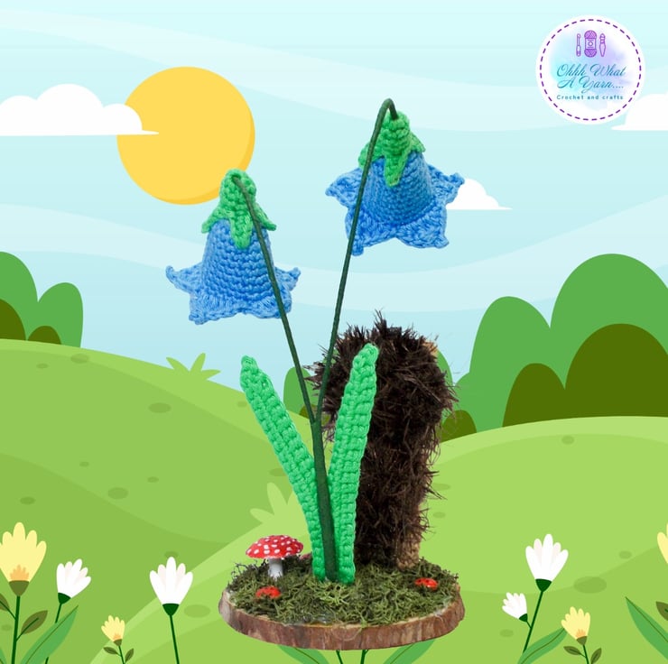 She is holding a teeny red airdry clay toadstool, and she is standing beneath two pretty crocheted bluebell flowers. The bluebells are wired so you can gently reposition them should you choose to.