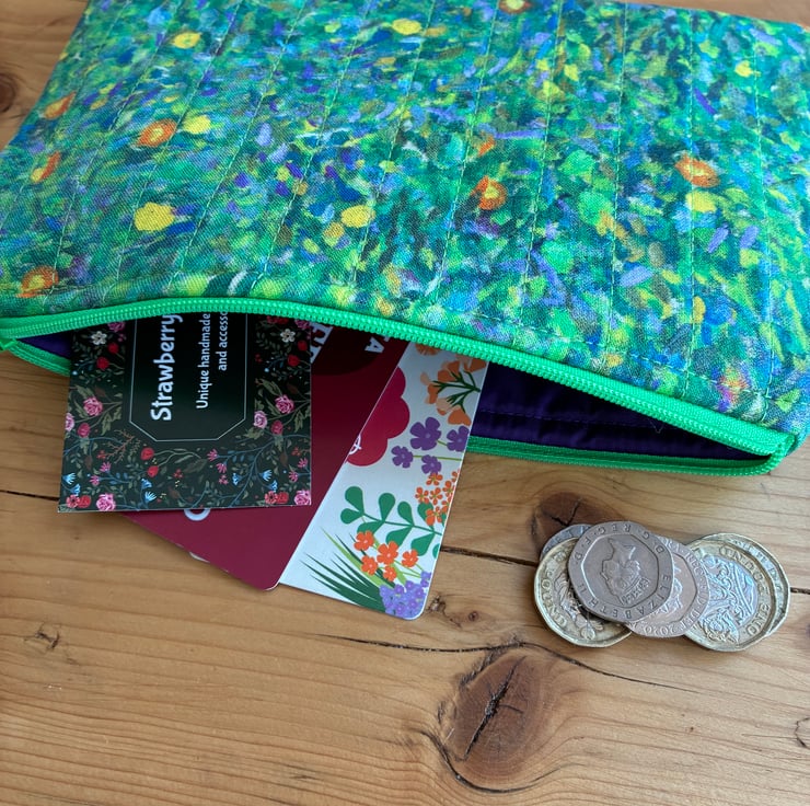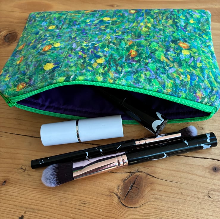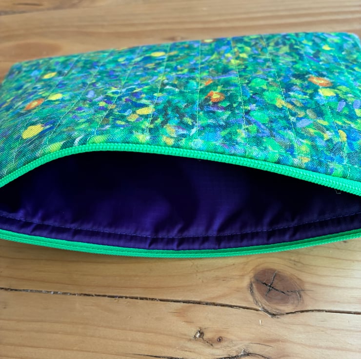 The pouch has a bright green zip and is fully lined with purple water resistant fabric.