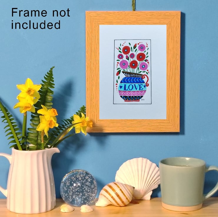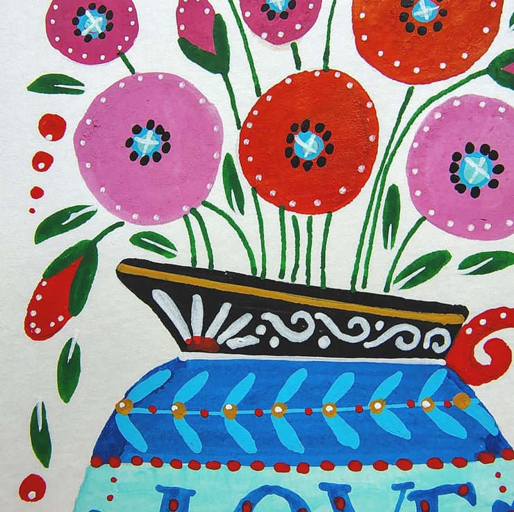 Brighten any room with this charming folk art painting featuring a vibrant bunch of pink and red poppies in a whimsical jug decorated with the word love. Full of floral patterns and joyful energy it’s makes the perfect gift for a flower lover or a cheerful addition to a gallery wall.