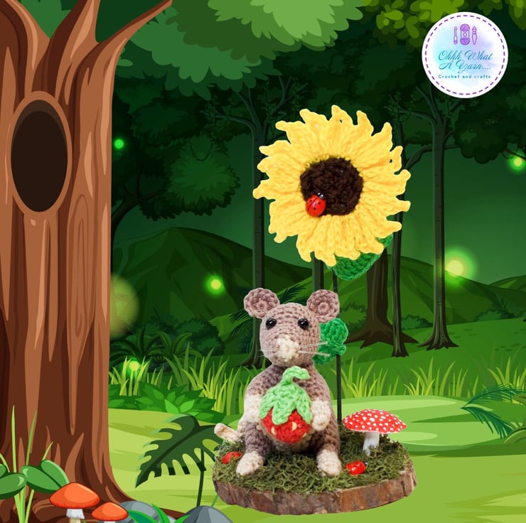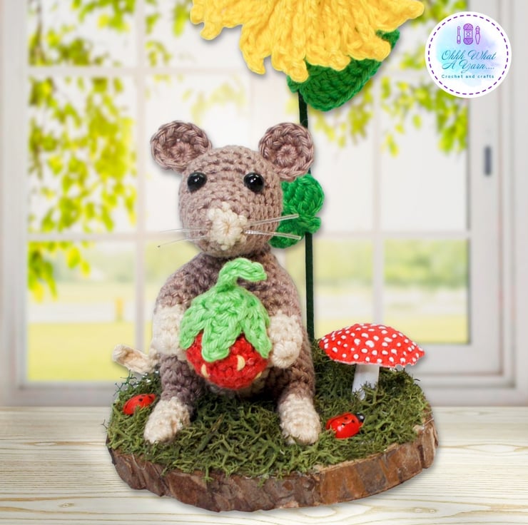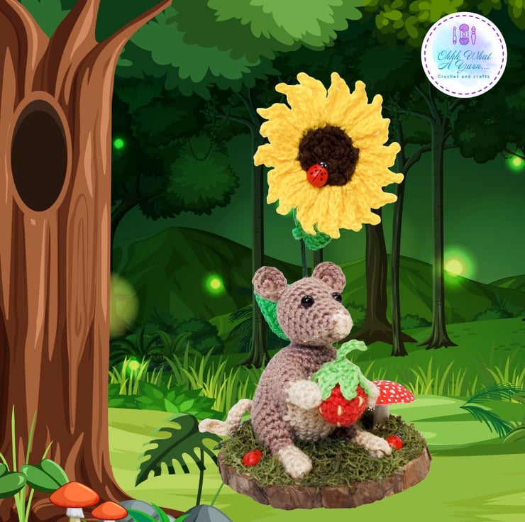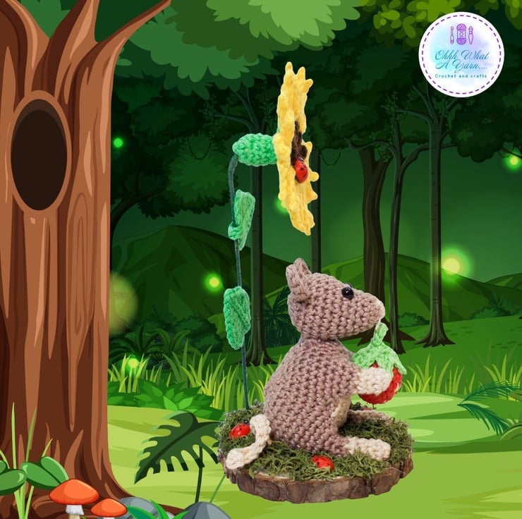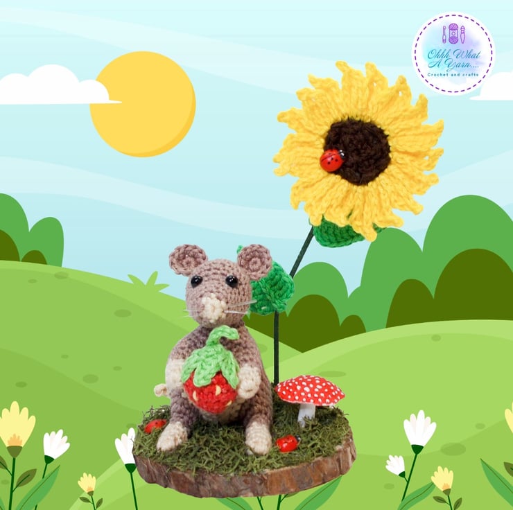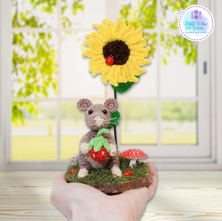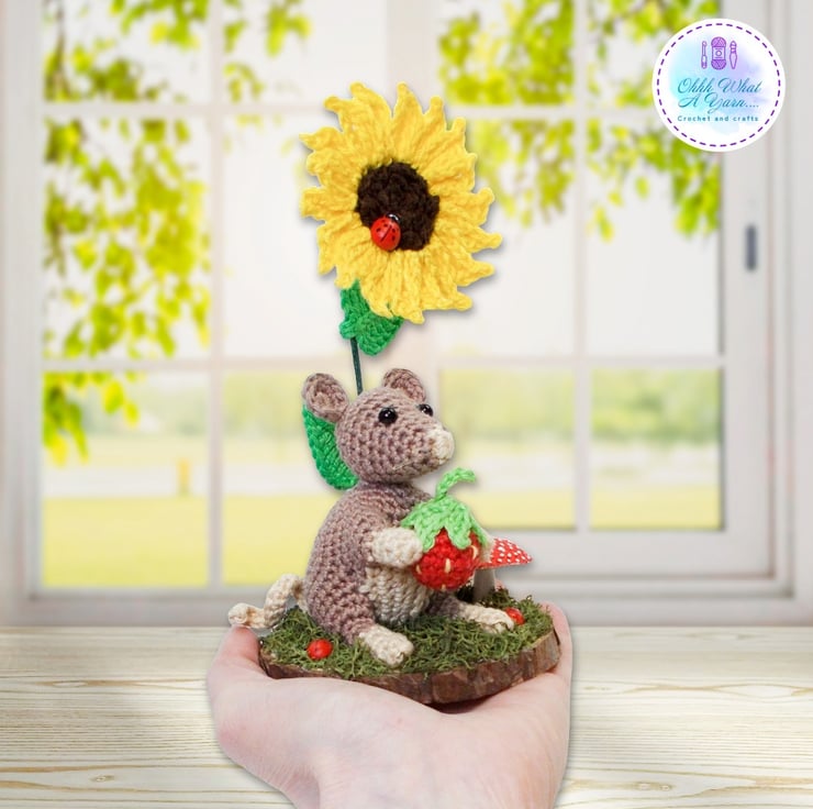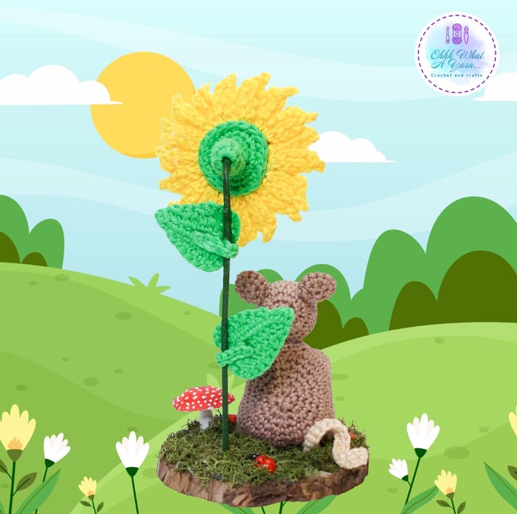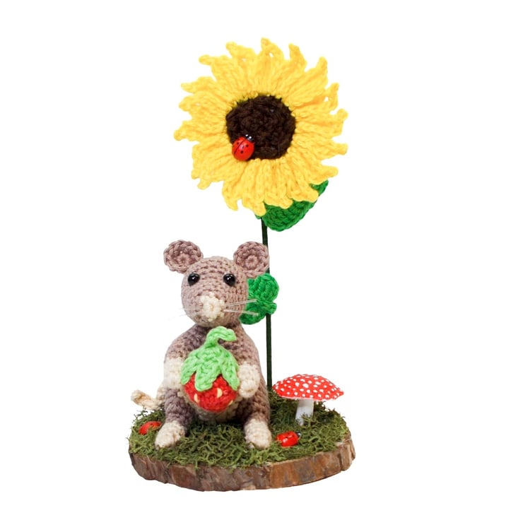 He is sitting on a round log slice which I have covered with reindeer moss, a hand painted airdry toadstool and little wooden ladybirds. Monty is sitting beneath a wired crochet sunflower which can be gently moved into other positions if you choose.