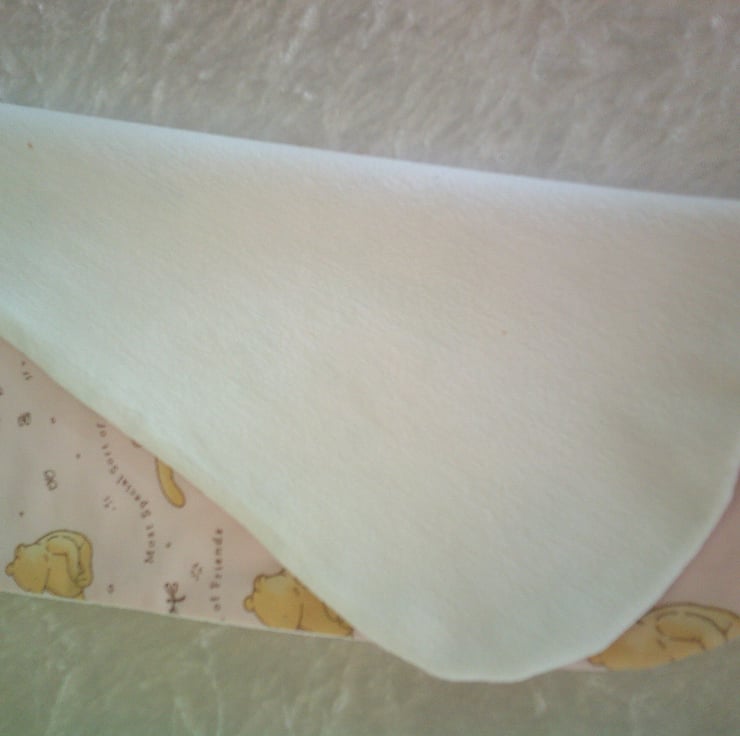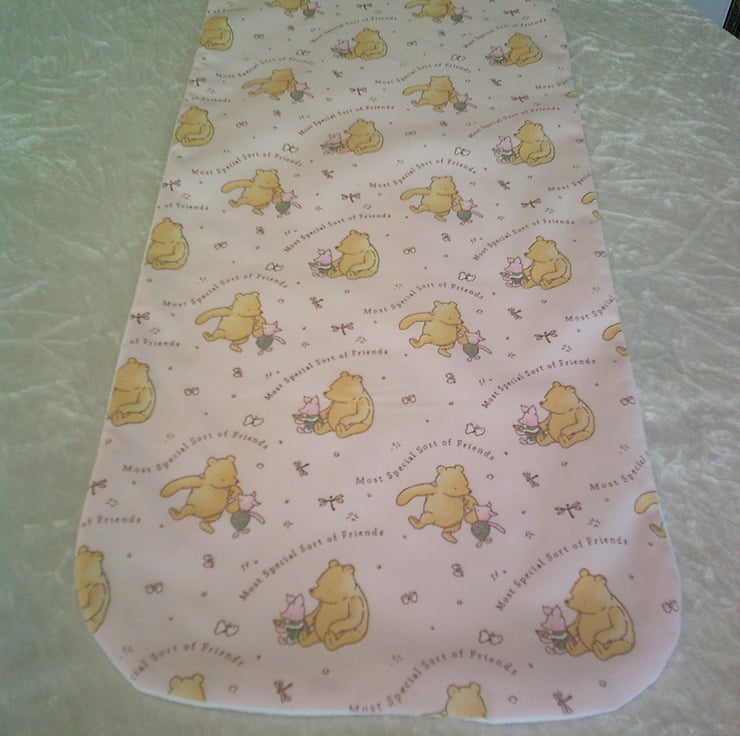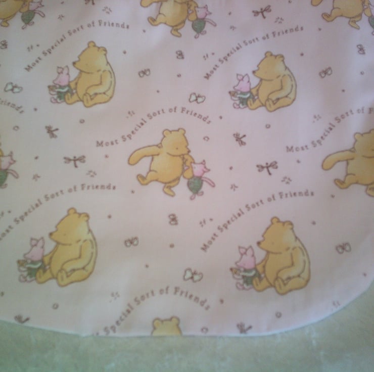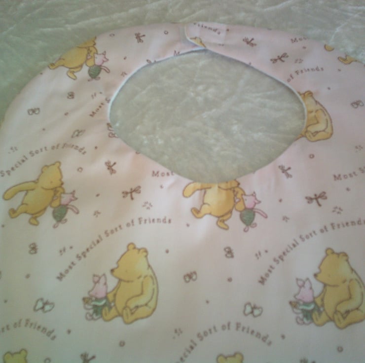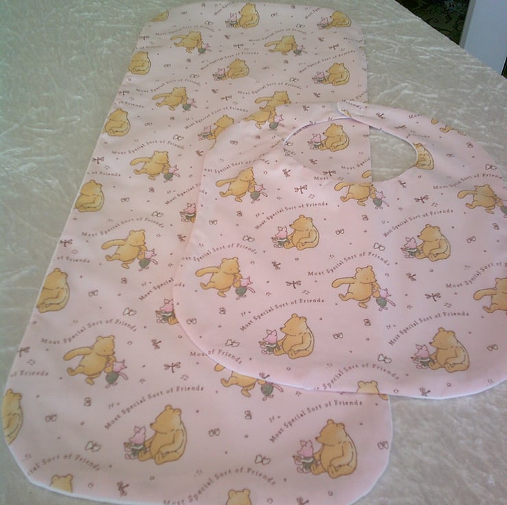 The fabric used is 100% cotton with a design of Winnie the Pooh on pale pink background on one side and both the bib and burp cloth have reverse side of white stretch terry towelling The bib also has a Velcro fastening on the back of the neck to making it easy to put on and take off.